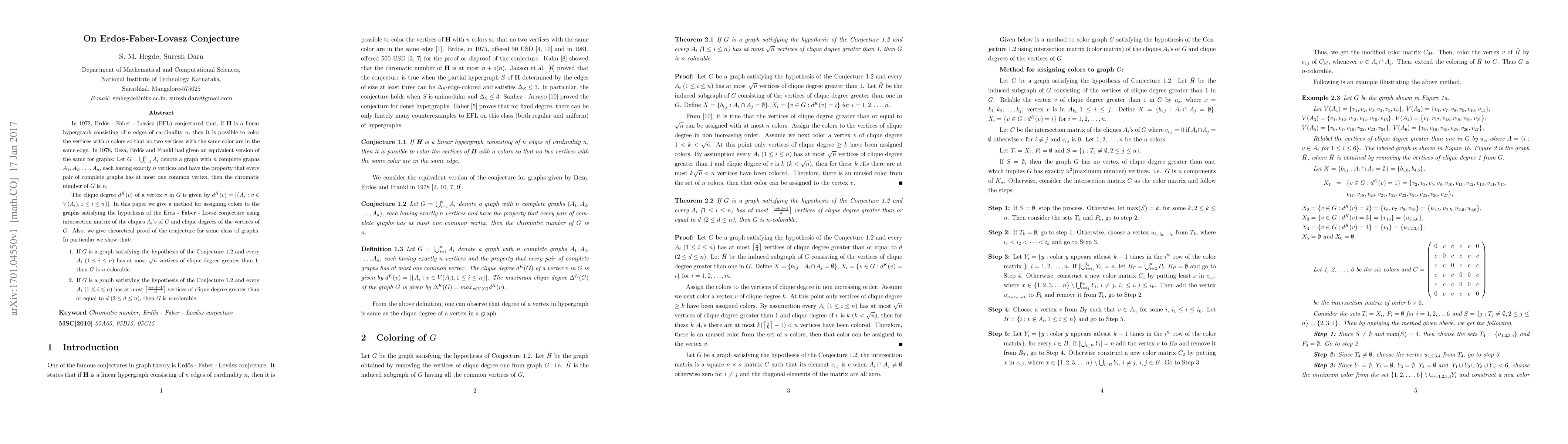 In 1972, Erd\"{o}s - Faber - Lov\'{a}sz (EFL) conjectured that, if $\textbf{H}$ is a linear hypergraph consisting of $n$ edges of cardinality $n$, then it is possible to color the vertices with $n$ colors so that no two vertices with the same color are in the same edge. In 1978, Deza, Erd\"{o}s and Frankl had given an equivalent version of the same for graphs: Let $G= \bigcup_{i=1}^{n} A_i$ denote a graph with $n$ complete graphs $A_1, A_2,$ $ \dots , A_n$, each having exactly $n$ vertices and have the property that every pair of complete graphs has at most one common vertex, then the chromatic number of $G$ is $n$. The clique degree $d^K(v)$ of a vertex $v$ in $G$ is given by $d^K(v) = |\{A_i: v \in V(A_i), 1 \leq i \leq n\}|$. In this paper we give a method for assigning colors to the graphs satisfying the hypothesis of the Erd\"os - Faber - Lov\'asz conjecture using intersection matrix of the cliques $A_i$'s of $G$ and clique degrees of the vertices of $G$. Also, we give theoretical proof of the conjecture for some class of graphs. In particular we show that: 1. If $G$ is a graph satisfying the hypothesis of the Conjecture 1.2 and every $A_i$ ($1 \leq i \leq n$) has at most $\sqrt{n}$ vertices of clique degree greater than 1, then $G$ is $n$-colorable. 2. If $G$ is a graph satisfying the hypothesis of the Conjecture 1.2 and every $A_i$ ($1 \leq i \leq n$) has at most $\left \lceil {\frac{n+d-1}{d}} \right \rceil$ vertices of clique degree greater than or equal to $d$ ($2\leq d \leq n$), then $G$ is $n$-colorable.