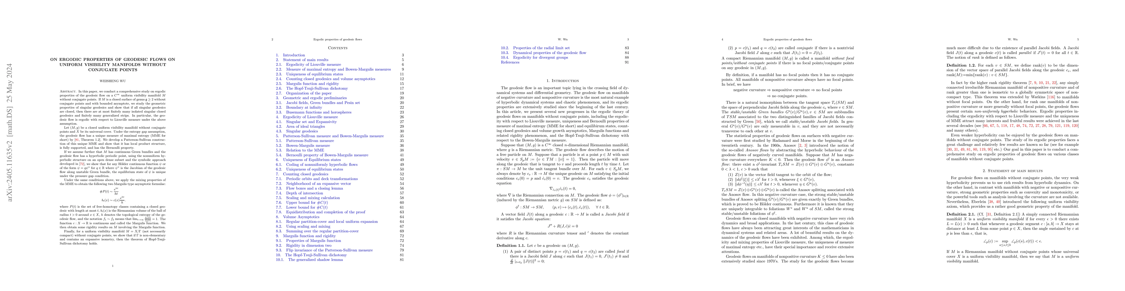 In this paper, we conduct a comprehensive study on ergodic properties of the geodesic flow on a $C^\infty$ uniform visibility manifold $M$ without conjugate points. If $M$ is a closed surface of genus at least two without conjugate points, and with continuous Green bundles and bounded asymptote, we study the geometric properties of singular geodesics and show that if all singular geodesics are closed, then there are at most finitely many isolated singular closed geodesics and finitely many generalized strips. In particular, the geodesic flow is ergodic with respect to Liouville measure under the above assumption. Let $(M,g)$ be a closed uniform visibility manifold without conjugate points and $X$ its universal cover. Under the entropy gap assumption, the geodesic flow has a unique measure of maximal entropy (MME for short) by \cite[Theorem 1.2]{MR}. We develop a Patterson-Sullivan construction of this unique MME and show that it has local product structure, is fully supported, and has the Bernoulli property. If we assume further that $M$ has continuous Green bundles and the geodesic flow has a hyperbolic periodic point, using the nonuniform hyperbolic structure on an open dense subset and the symbolic approach developed in \cite{LP}, we show that for any H\"{o}lder continuous function, the equilibrium state is unique under the pressure gap condition. Under the same conditions above, we apply the mixing properties of the MME to count the number of free-homotopy classes containing a closed geodesic, as well as the volume asymptotics of Riemannian balls in the universal cover. We then obtain some rigidity results involving the Margulis function. Finally, for a uniform visibility manifold $M=X/\Gamma$ (not necessarily compact) without conjugate points, we show that if $\Gamma$ is non-elementary and contains an expansive isometry, then the Hopf-Tsuji-Sullivan dichotomy holds.