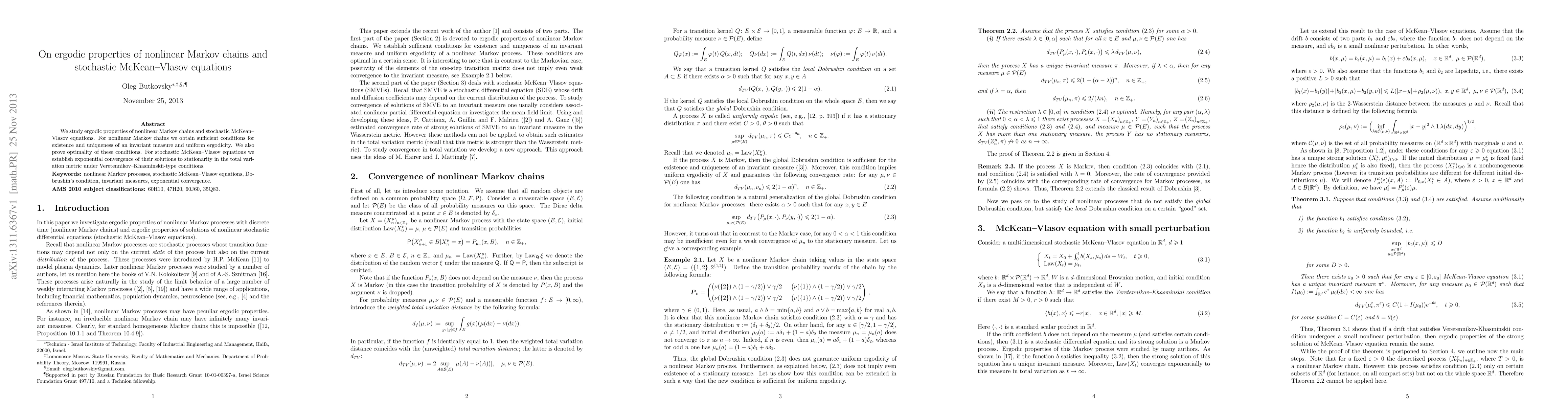 This paper investigates ergodic properties of nonlinear Markov chains and stochastic McKean-Vlasov equations, establishing sufficient conditions for the existence and uniqueness of invariant measures and uniform ergodicity for the chains. For the stochastic McKean-Vlasov equations, it proves exponential convergence to stationarity under specific conditions.