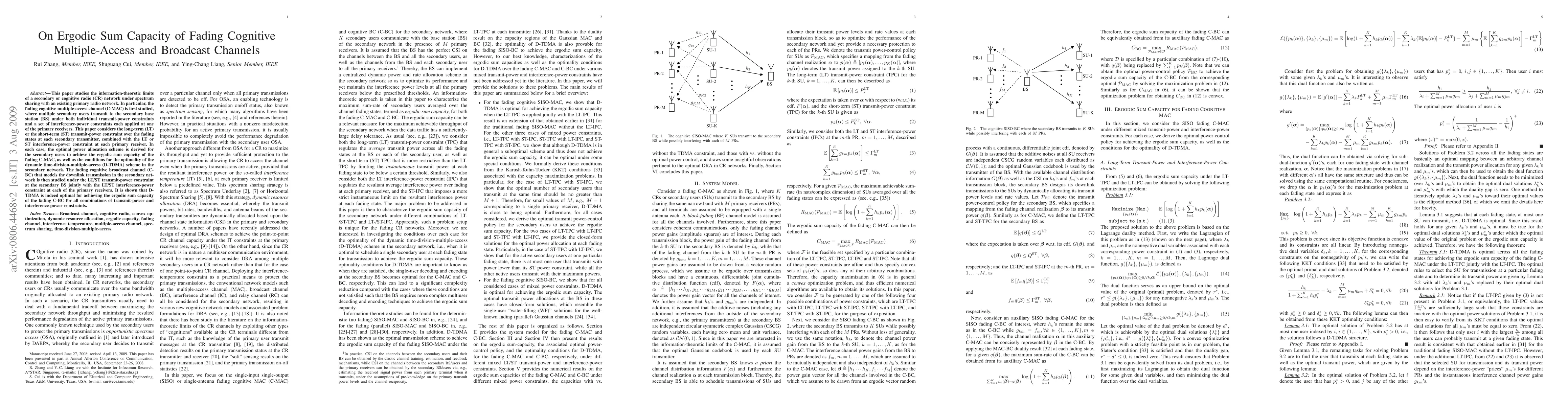 This paper investigates the ergodic sum capacity of cognitive radio networks under fading conditions, with a focus on both multiple-access and broadcast channels. It derives optimal power allocation schemes for secondary users and confirms the optimality of dynamic time-division-multiple-access (D-TDMA) for achieving maximum capacity under various transmit and interference constraints.