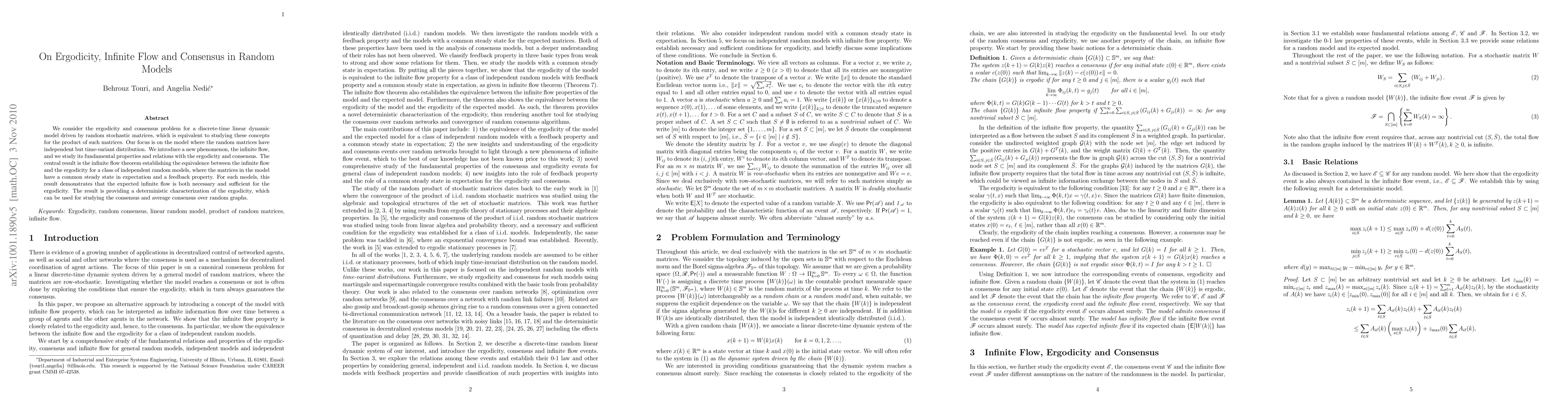 We consider the ergodicity and consensus problem for a discrete-time linear dynamic model driven by random stochastic matrices, which is equivalent to studying these concepts for the product of such matrices. Our focus is on the model where the random matrices have independent but time-variant distribution. We introduce a new phenomenon, the infinite flow, and we study its fundamental properties and relations with the ergodicity and consensus. The central result is the infinite flow theorem establishing the equivalence between the infinite flow and the ergodicity for a class of independent random models, where the matrices in the model have a common steady state in expectation and a feedback property. For such models, this result demonstrates that the expected infinite flow is both necessary and sufficient for the ergodicity. The result is providing a deterministic characterization of the ergodicity, which can be used for studying the consensus and average consensus over random graphs.