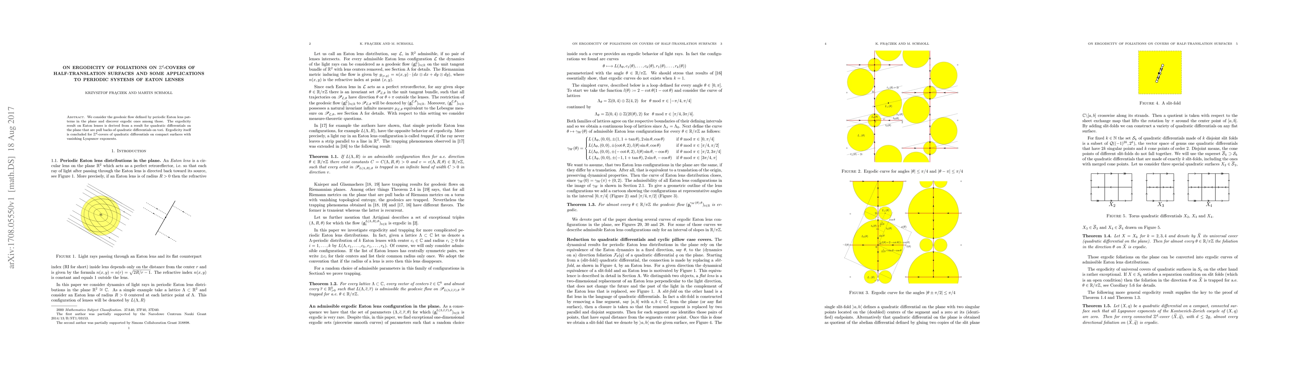 Summary: This paper investigates ergodic geodesic flows in Eaton lens patterns and extends the results to $\mathbb{Z}^d$-covers of half-translation surfaces, establishing ergodicity for systems with vanishing Lyapunov exponents and providing applications to periodic Eaton lens systems.