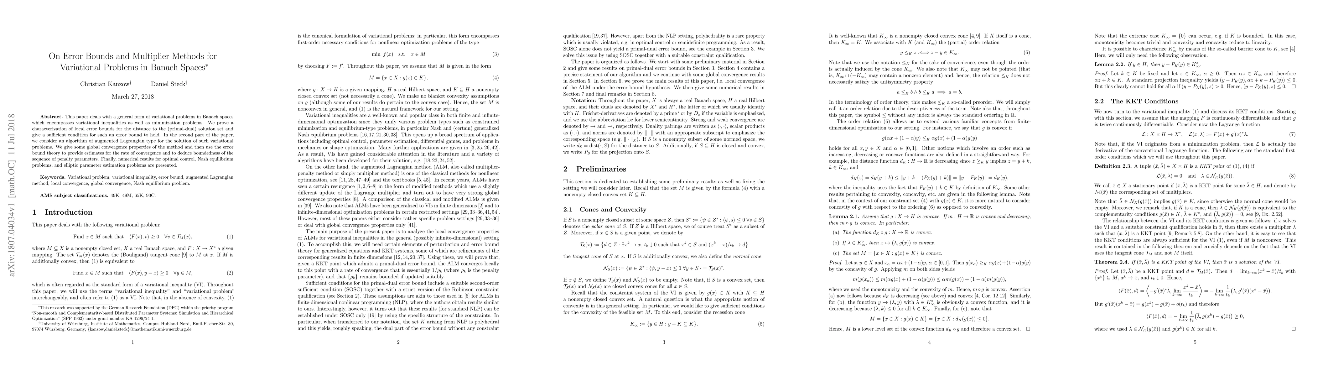 This paper characterizes local error bounds for variational problems in Banach spaces and provides a sufficient condition for their existence. It also introduces an augmented Lagrangian algorithm, proving its global convergence and estimating the rate of convergence, followed by numerical results for various applications.