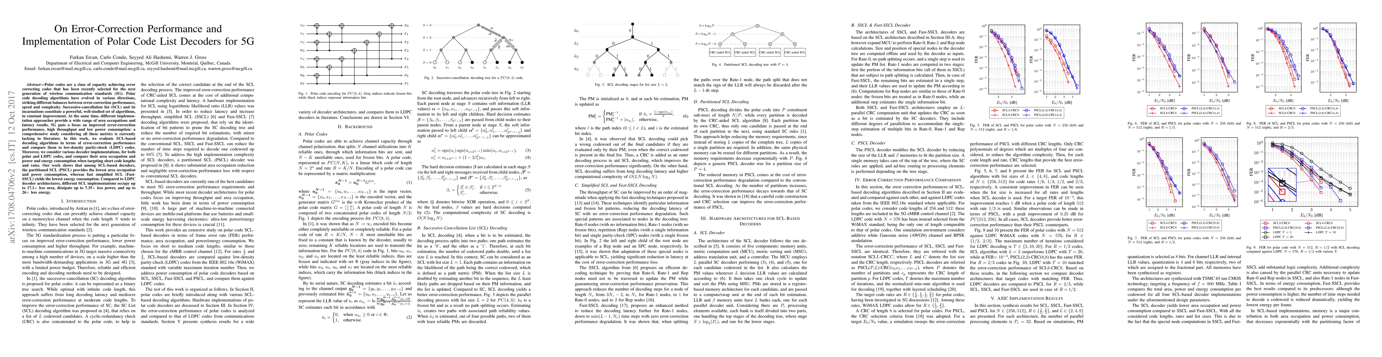 Polar codes are a class of capacity achieving error correcting codes that has been recently selected for the next generation of wireless communication standards (5G). Polar code decoding algorithms have evolved in various directions, striking different balances between error-correction performance, speed and complexity. Successive-cancellation list (SCL) and its incarnations constitute a powerful, well-studied set of algorithms, in constant improvement. At the same time, different implementation approaches provide a wide range of area occupations and latency results. 5G puts a focus on improved error-correction performance, high throughput and low power consumption: a comprehensive study considering all these metrics is currently lacking in literature. In this work, we evaluate SCL-based decoding algorithms in terms of error-correction performance and compare them to low-density parity-check (LDPC) codes. Moreover, we consider various decoder implementations, for both polar and LDPC codes, and compare their area occupation and power and energy consumption when targeting short code lengths and rates. Our work shows that among SCL-based decoders, the partitioned SCL (PSCL) provides the lowest area occupation and power consumption, whereas fast simplified SCL (Fast-SSCL) yields the lowest energy consumption. Compared to LDPC decoder architectures, different SCL implementations occupy up to 17.1x less area, dissipate up to 7.35x less power, and up to 26x less energy.