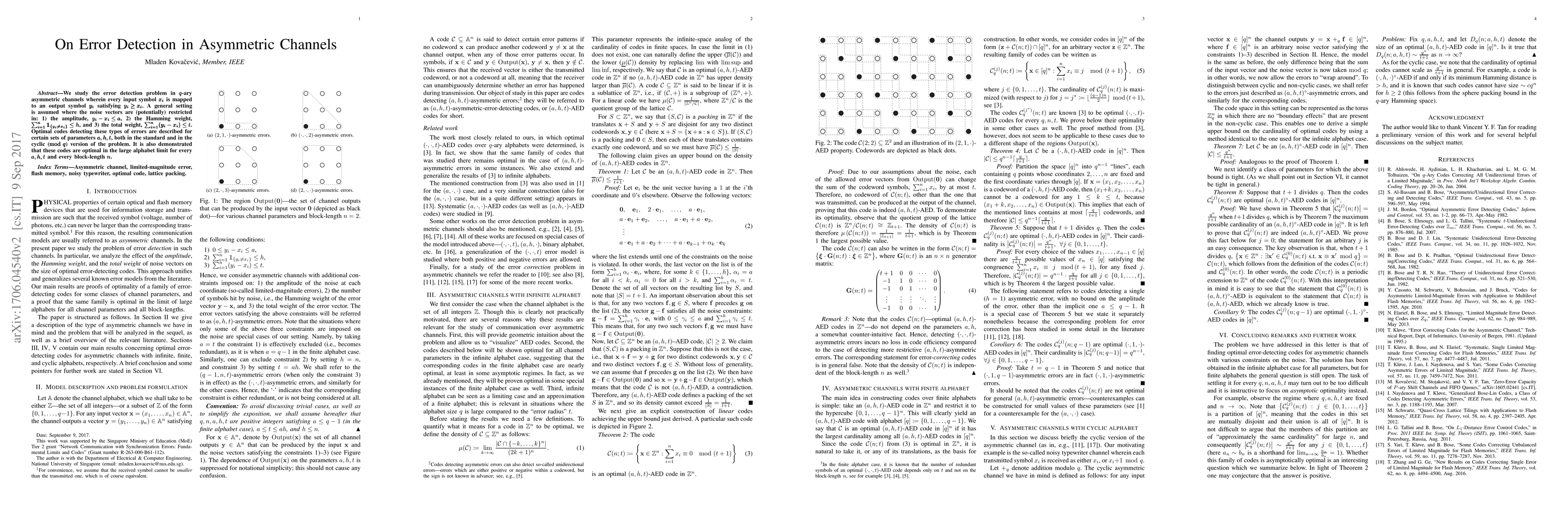 This paper investigates error detection in asymmetric channels with limited noise vectors, proposing optimal codes for certain parameters and demonstrating their optimality across different alphabet sizes and block lengths.