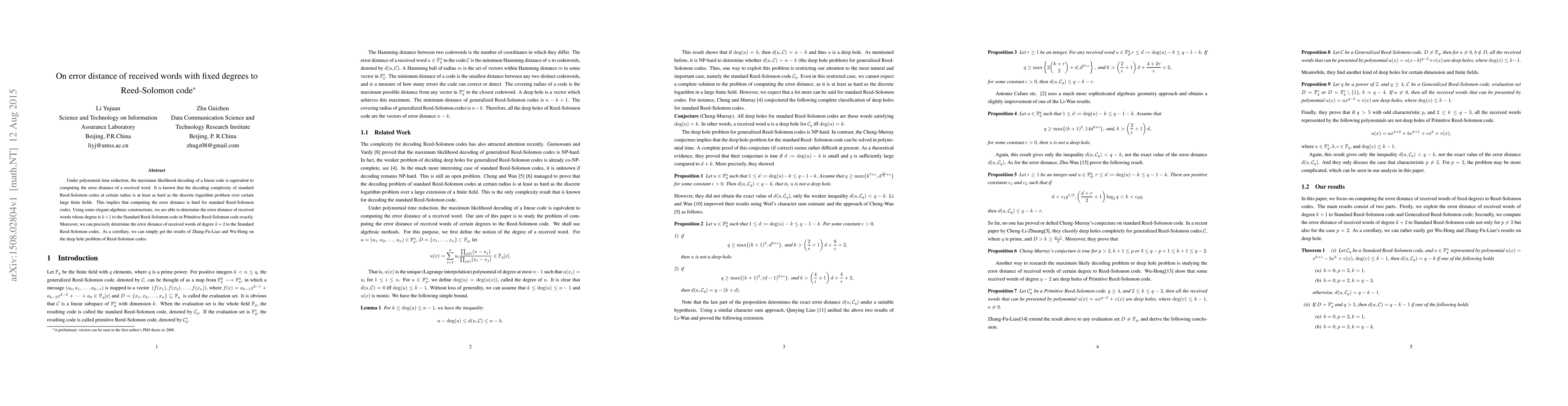 This paper explores the error distance computation for received words of fixed degrees to Reed-Solomon codes, demonstrating that it is computationally hard. It introduces algebraic methods to accurately determine the error distance for received words of degrees k+1 and k+2, thereby resolving the deep hole problem for these codes.