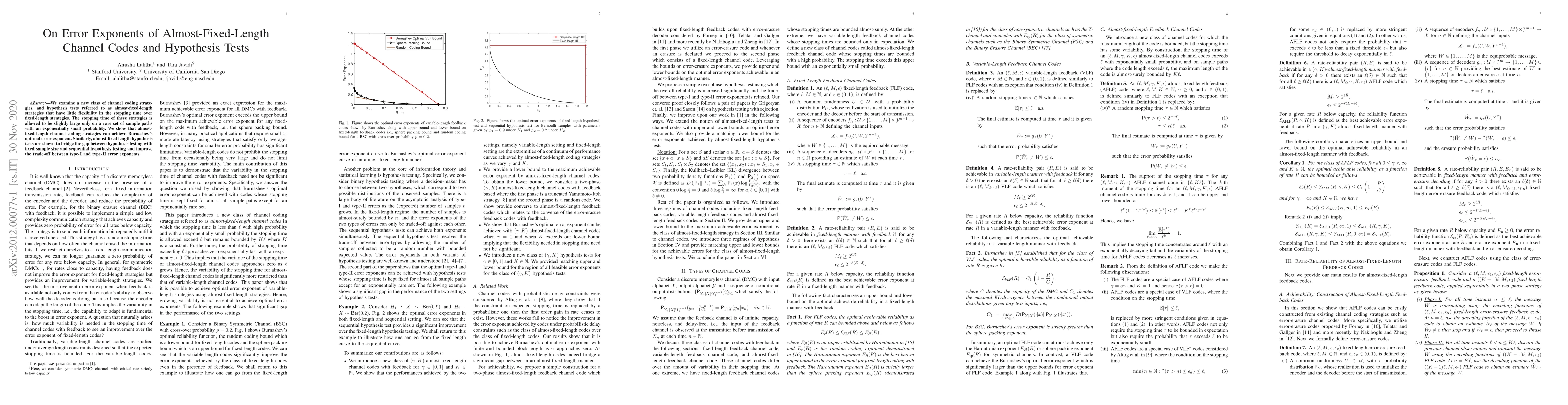This paper explores almost-fixed-length channel coding strategies and hypothesis tests, demonstrating they achieve optimal error exponents and improve the trade-off between type-I and type-II error exponents compared to traditional fixed-length methods.