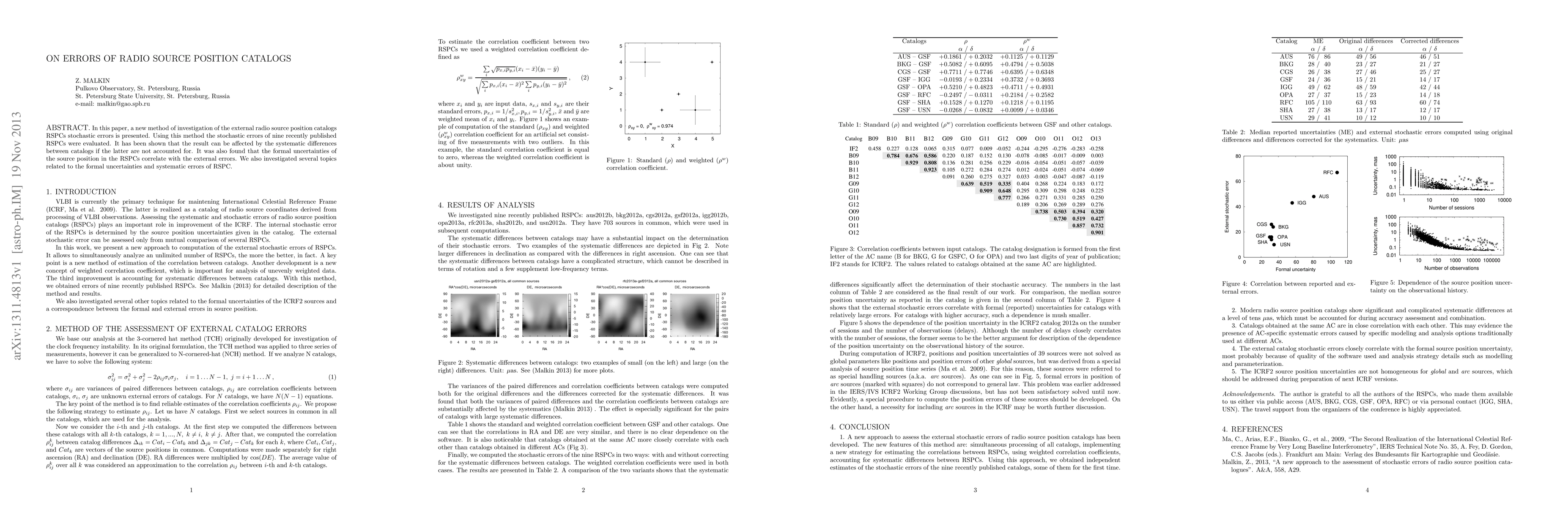 This paper introduces a new method for assessing stochastic errors in radio source position catalogs (RSPCs), evaluating the errors in nine recently published catalogs and highlighting the impact of systematic differences between catalogs. It also finds a correlation between the formal uncertainties in RSPCs and external errors.