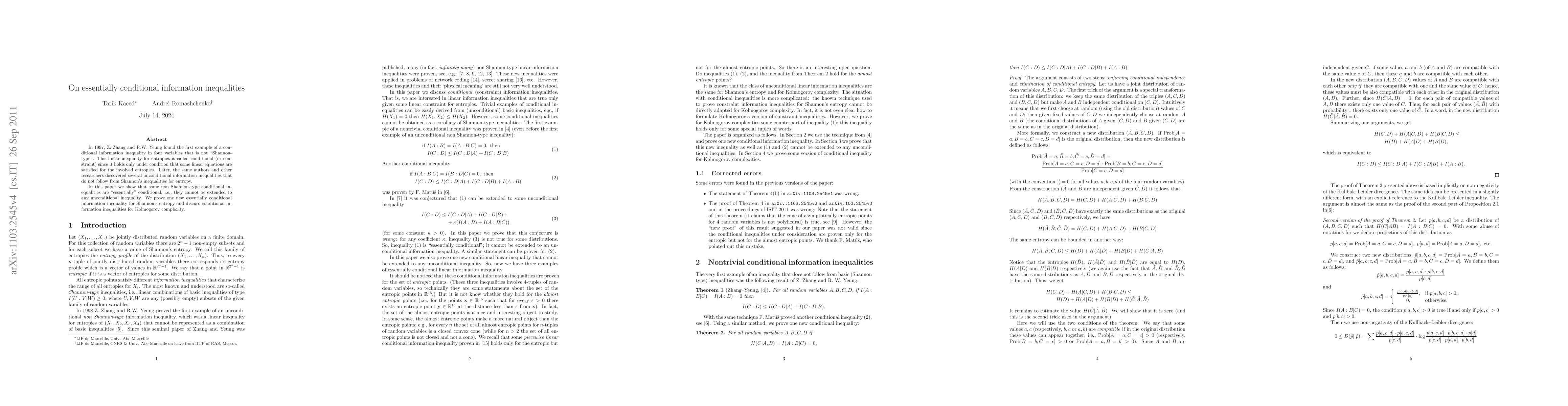 This paper demonstrates that certain non-Shannon-type conditional information inequalities are "essentially" conditional, meaning they cannot be generalized into unconditional inequalities. It introduces a new essentially conditional inequality for Shannon's entropy and explores conditional information inequalities related to Kolmogorov complexity.