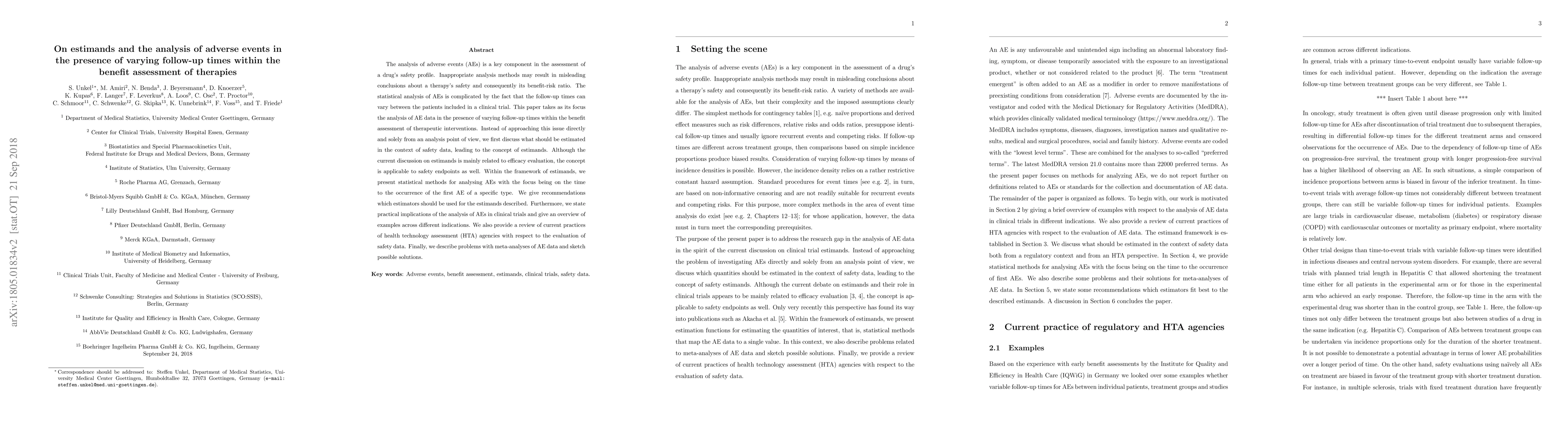 This paper discusses the concept of estimands in the context of analyzing adverse events (AEs) with varying follow-up times in clinical trials. It proposes statistical methods for assessing AEs, recommends appropriate estimators, and reviews current practices in health technology assessment, highlighting challenges in meta-analyses of AE data.