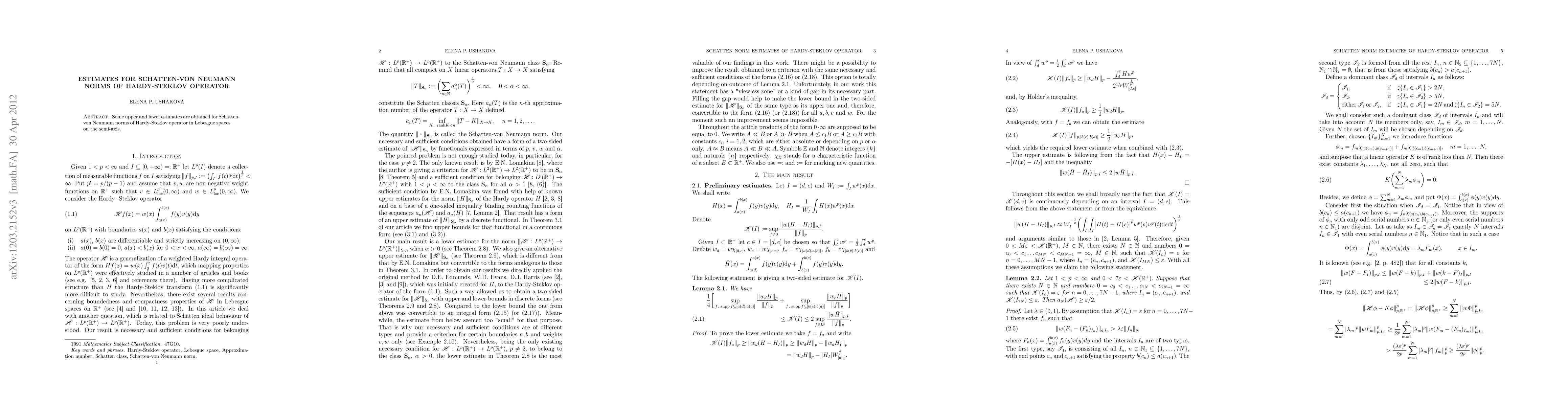 Upper and lower estimates are obtained for the Schatten-von Neumann norms of the Hardy-Steklov operator in Lebesgue function spaces on the semi-axis.