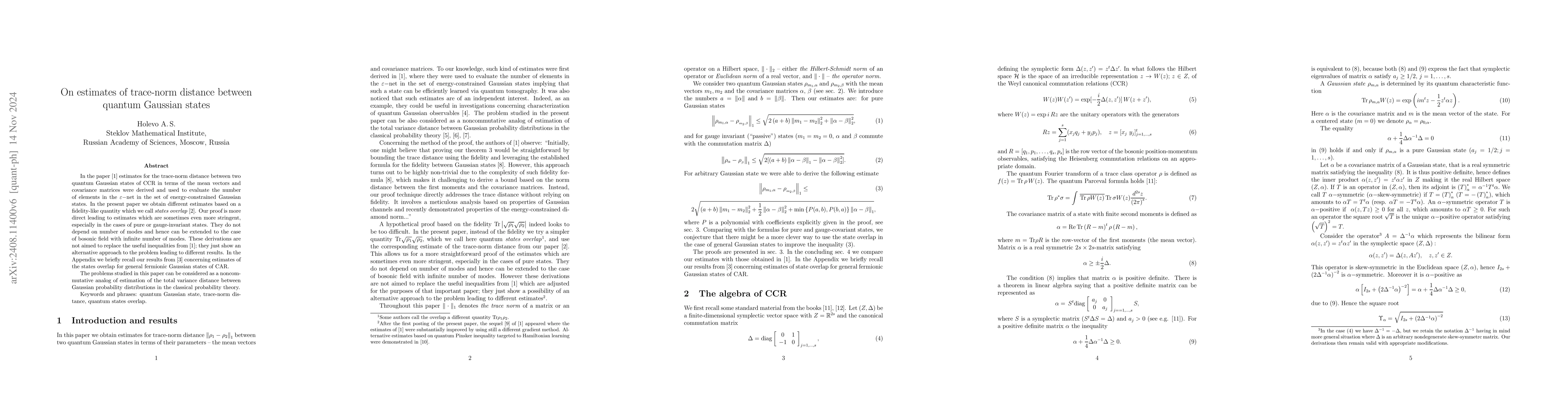 In the paper of F.A. Mele, A.A. Mele, L. Bittel, J. Eisert, V. Giovannetti, L. Lami, L. Leone, S.F.E. Oliviero, ArXiv:2405.01431, estimates for the trace-norm distance between two quantum Gaussian states in terms of the mean vectors and covariance matrices were derived and used to evaluate the sample complexity of learning quantum energy-constrained Gaussian states. In the present paper we obtain different estimates; our proof is based on a fidelity-like quantity which we call states overlap, and is more straightforward leading to estimates which are sometimes even more stringent, especially in the cases of pure or gauge-invariant states. They do not depend on number of modes and hence can be extended to the case of bosonic field with infinite number of modes. These derivations are not aimed to replace the useful inequalities from ArXiv:2405.01431; they just show an alternative approach to the problem leading to different results. In the Appendix we briefly recall our results concerning estimates of the overlap for general fermionic Gaussian states of CAR. The problem studied in this paper can be considered as a noncommutative analog of estimation of the total variance distance between Gaussian probability distributions in the classical probability theory.