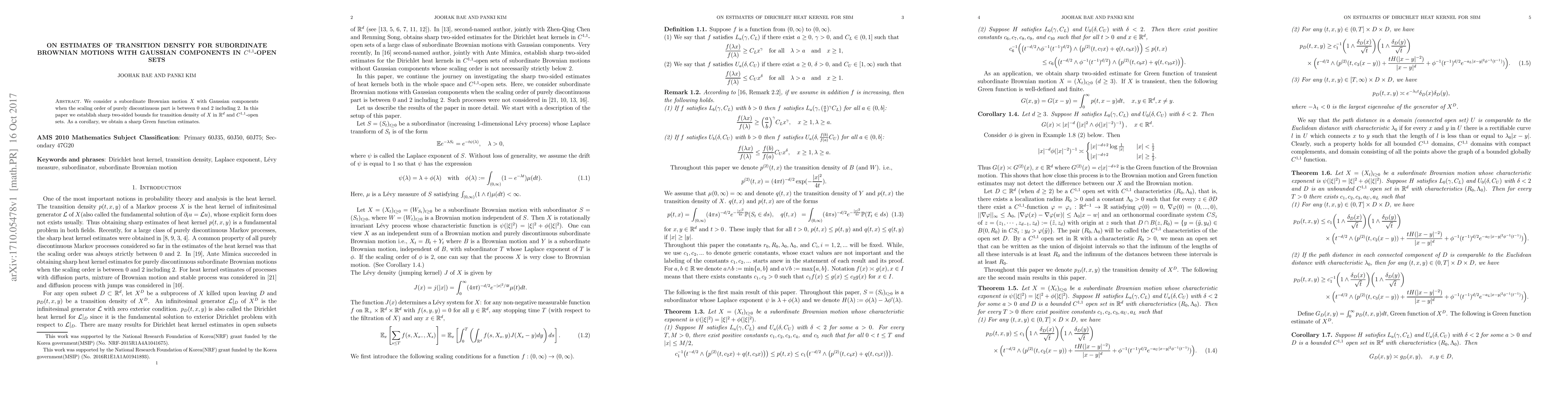 This paper establishes sharp bounds for the transition density of a subordinate Brownian motion with Gaussian components in $\mathbb{R}^d$ and $C^{1,1}$-open sets, with the scaling order of the discontinuous part ranging from $0$ to $2$. The results also yield precise Green function estimates as a corollary.