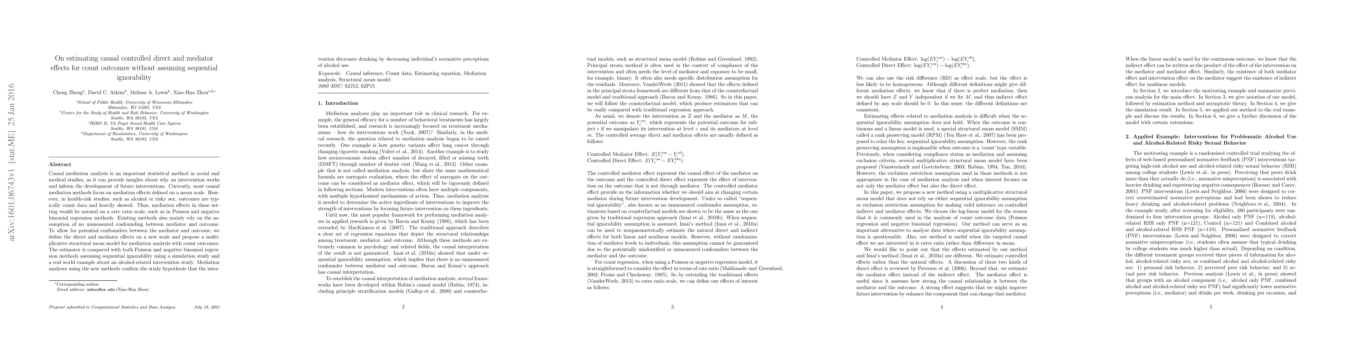 This paper proposes a new method for estimating causal direct and mediator effects for count outcomes, focusing on rate ratios rather than mean differences, and without assuming sequential ignorability. The method is evaluated through simulations and an alcohol-related intervention study, confirming that the intervention reduces drinking by altering individuals' perceptions of alcohol use.