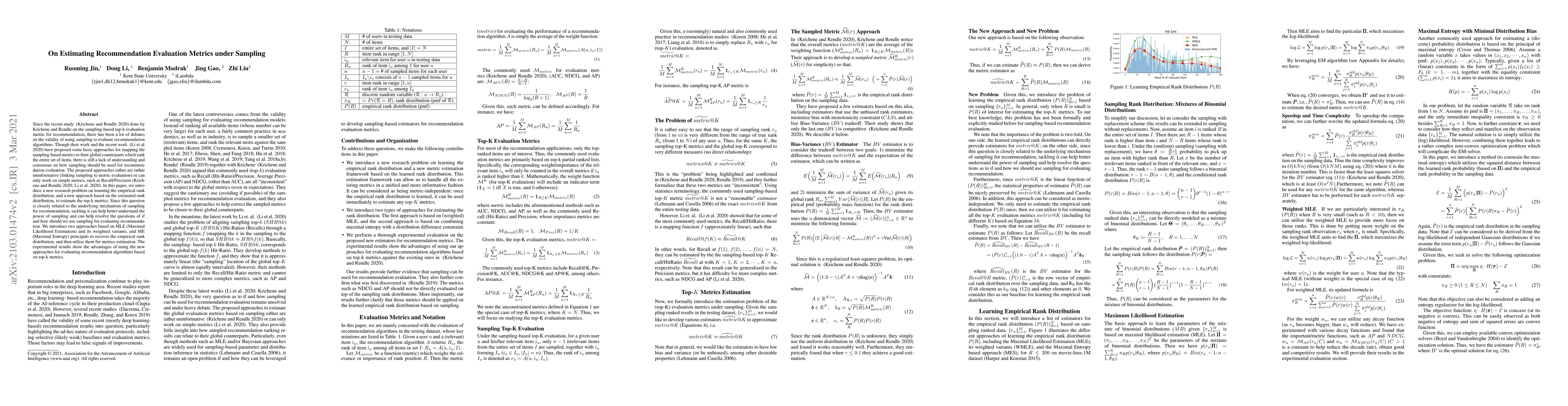 Since the recent study (Krichene and Rendle 2020) done by Krichene and Rendle on the sampling-based top-k evaluation metric for recommendation, there has been a lot of debates on the validity of using sampling to evaluate recommendation algorithms. Though their work and the recent work (Li et al.2020) have proposed some basic approaches for mapping the sampling-based metrics to their global counterparts which rank the entire set of items, there is still a lack of understanding and consensus on how sampling should be used for recommendation evaluation. The proposed approaches either are rather uninformative (linking sampling to metric evaluation) or can only work on simple metrics, such as Recall/Precision (Krichene and Rendle 2020; Li et al. 2020). In this paper, we introduce a new research problem on learning the empirical rank distribution, and a new approach based on the estimated rank distribution, to estimate the top-k metrics. Since this question is closely related to the underlying mechanism of sampling for recommendation, tackling it can help better understand the power of sampling and can help resolve the questions of if and how should we use sampling for evaluating recommendation. We introduce two approaches based on MLE (MaximalLikelihood Estimation) and its weighted variants, and ME(Maximal Entropy) principals to recover the empirical rank distribution, and then utilize them for metrics estimation. The experimental results show the advantages of using the new approaches for evaluating recommendation algorithms based on top-k metrics.