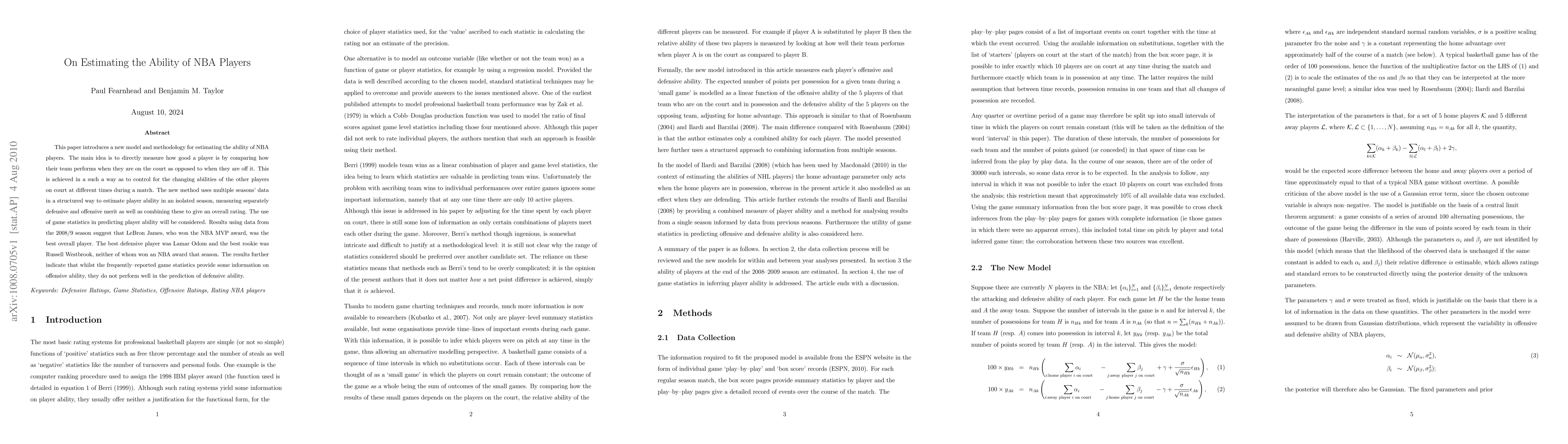 A new method estimates NBA player ability by analyzing team performance with players on and off the court, revealing LeBron James as the best overall player in the 2008/9 season. The study also shows that game statistics don't accurately predict defensive ability.