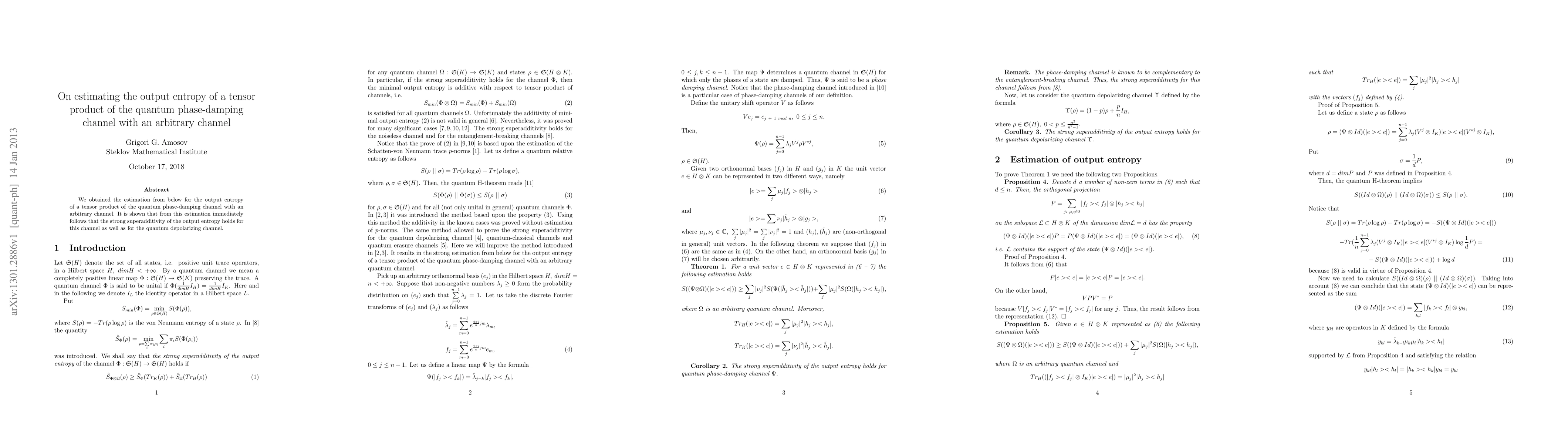 This paper estimates the output entropy of a tensor product of quantum phase-damping channels with an arbitrary channel, showing strong superadditivity holds for both channels.