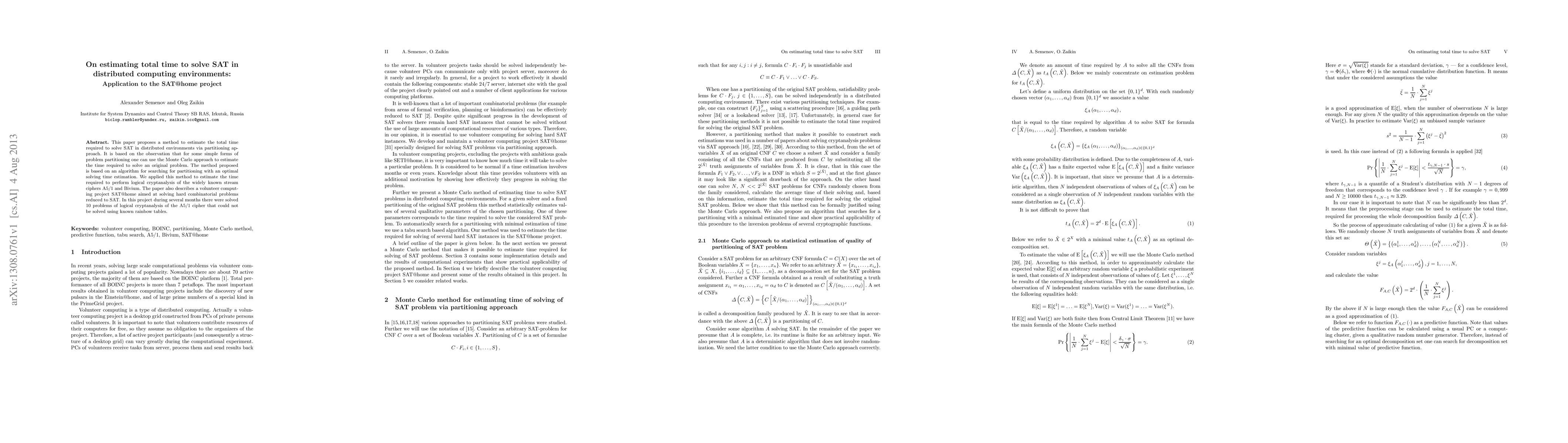 Researchers developed a method to estimate the time required to solve SAT problems in distributed environments, using a partitioning approach that applies the Monte Carlo method for optimal solving time estimation. The approach was applied to estimate the time needed for logical cryptanalysis of certain ciphers and successfully solved previously unsolvable problems.