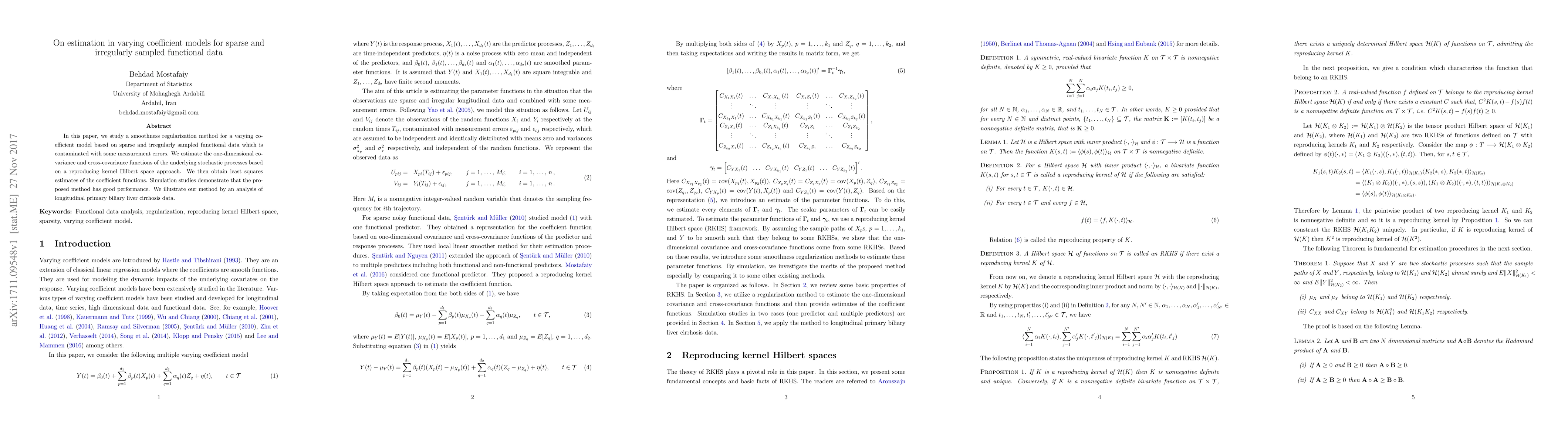This paper proposes a smoothness regularization method for varying coefficient models applied to sparse and irregularly sampled functional data, estimating covariance functions using a reproducing kernel Hilbert space approach. Simulation studies show the method's effectiveness, and it is demonstrated through an analysis of primary biliary liver cirrhosis data.