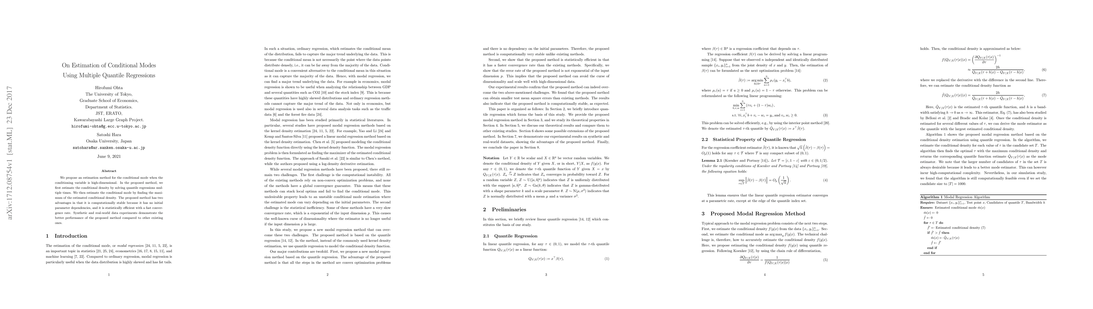 This paper introduces a new method for estimating conditional modes in high-dimensional data using multiple quantile regressions to estimate the conditional density, followed by finding the density's maximum. The method is computationally stable and statistically efficient, outperforming existing techniques in both synthetic and real-world experiments.