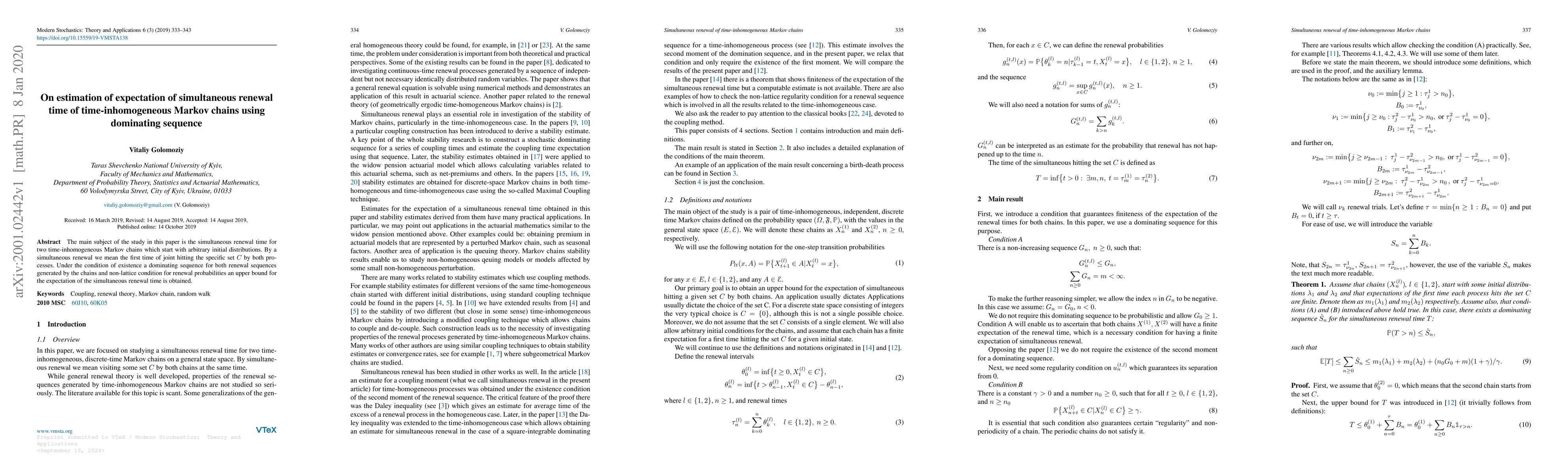 The main subject of the study in this paper is the simultaneous renewal time for two time-inhomogeneous Markov chains which start with arbitrary initial distributions. By a simultaneous renewal we mean the first time of joint hitting the specific set $C$ by both processes. Under the condition of existence a dominating sequence for both renewal sequences generated by the chains and non-lattice condition for renewal probabilities an upper bound for the expectation of the simultaneous renewal time is obtained.