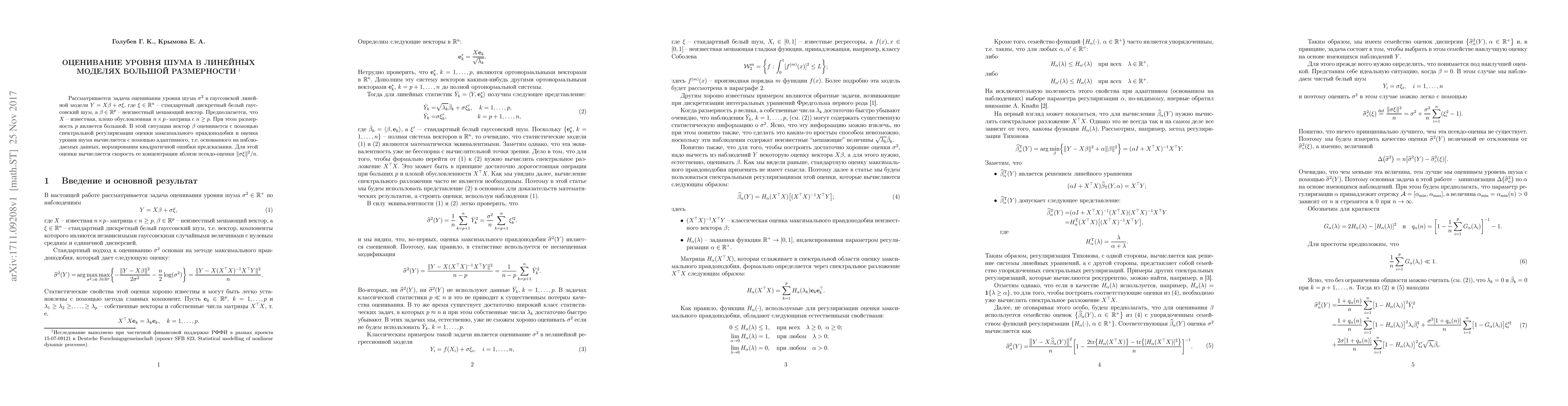 A method is proposed to estimate the noise variance in high-dimensional linear models using spectral regularizers and adaptive normalization, with an upper bound on concentration around the ideal estimator for zero nuisance.