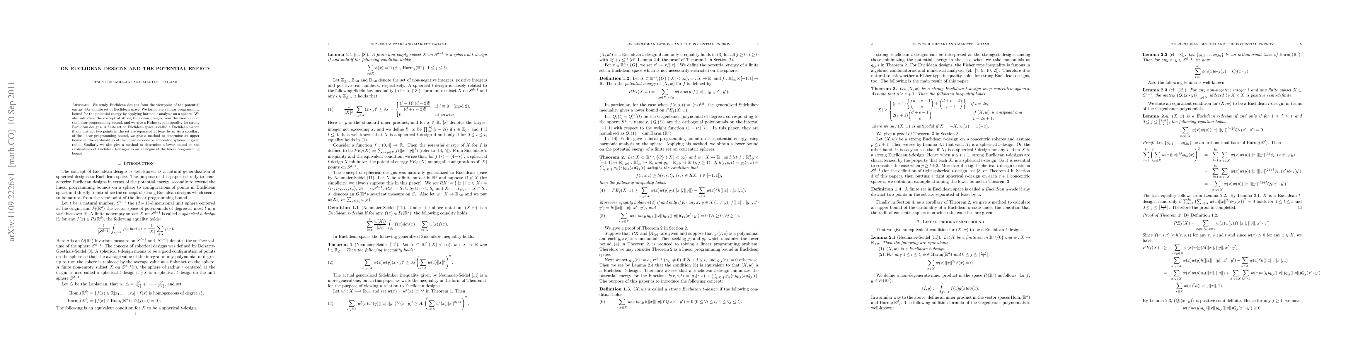 The paper studies Euclidean designs using potential energy, formulating a linear programming bound for potential energy via harmonic analysis on a sphere. It introduces strong Euclidean designs and provides a Fisher type inequality for them.