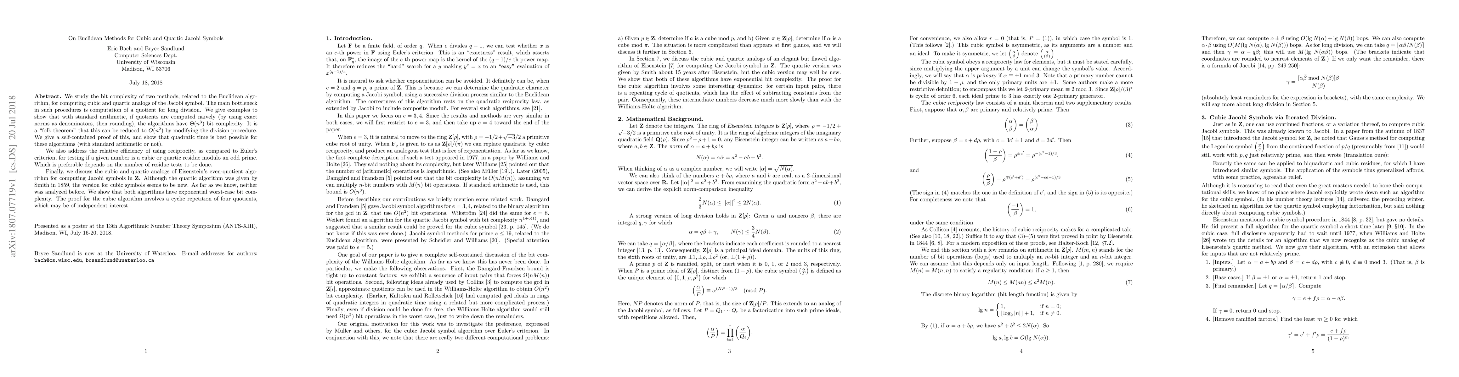 Researchers developed more efficient algorithms for computing cubic and quartic Jacobi symbols using Euclidean methods, reducing bit complexity from O(n^3) to O(n^2), while also analyzing the efficiency of reciprocity testing and exponential worst-case complexity.