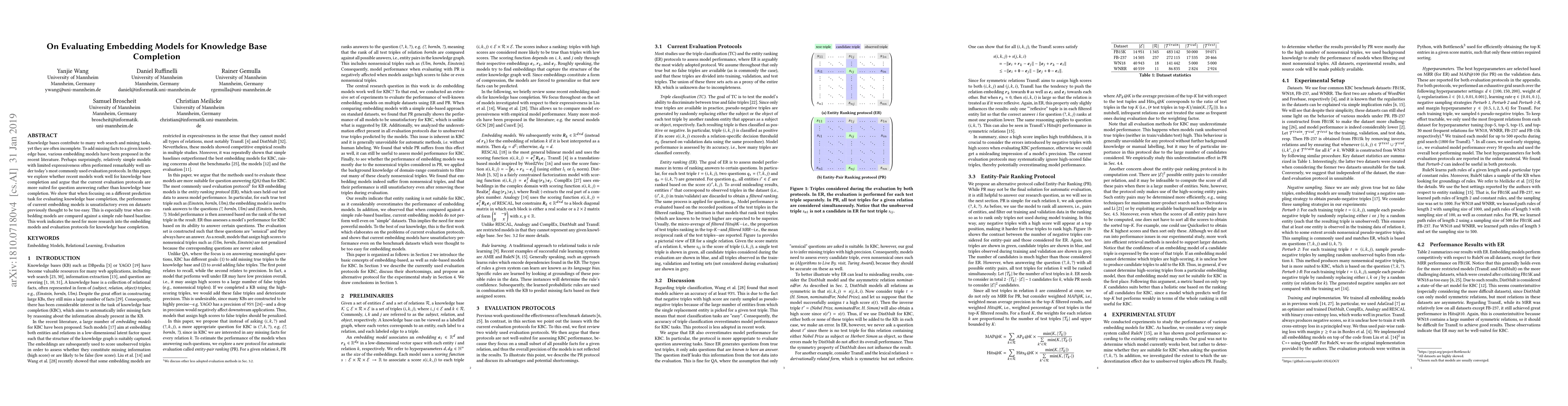 Knowledge bases contribute to many web search and mining tasks, yet they are often incomplete. To add missing facts to a given knowledge base, various embedding models have been proposed in the recent literature. Perhaps surprisingly, relatively simple models with limited expressiveness often performed remarkably well under today's most commonly used evaluation protocols. In this paper, we explore whether recent models work well for knowledge base completion and argue that the current evaluation protocols are more suited for question answering rather than knowledge base completion. We show that when focusing on a different prediction task for evaluating knowledge base completion, the performance of current embedding models is unsatisfactory even on datasets previously thought to be too easy. This is especially true when embedding models are compared against a simple rule-based baseline. This work indicates the need for more research into the embedding models and evaluation protocols for knowledge base completion.