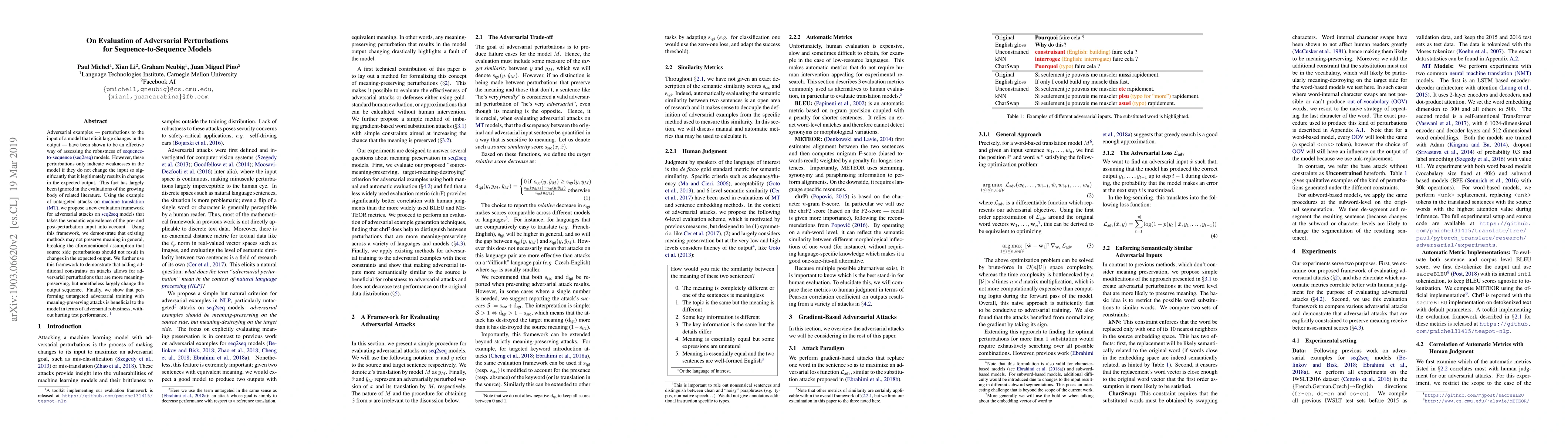 This paper proposes a new evaluation framework for assessing adversarial perturbations in sequence-to-sequence models, emphasizing the importance of semantic equivalence between pre- and post-perturbation inputs. The study demonstrates that existing methods often fail to preserve meaning, and shows that meaning-preserving attacks can improve adversarial robustness without compromising performance.