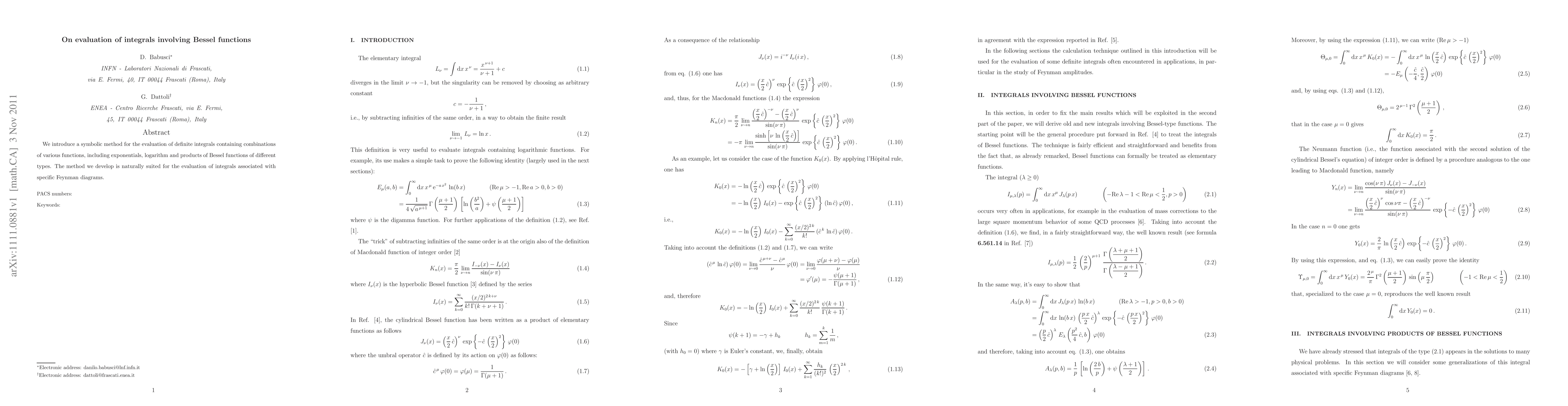 Summary: This paper presents a symbolic method for evaluating definite integrals involving combinations of Bessel functions, exponentials, and logarithms, particularly useful for integrals related to specific Feynman diagrams in quantum field theory. The method is designed to simplify and systematically handle complex integrals.