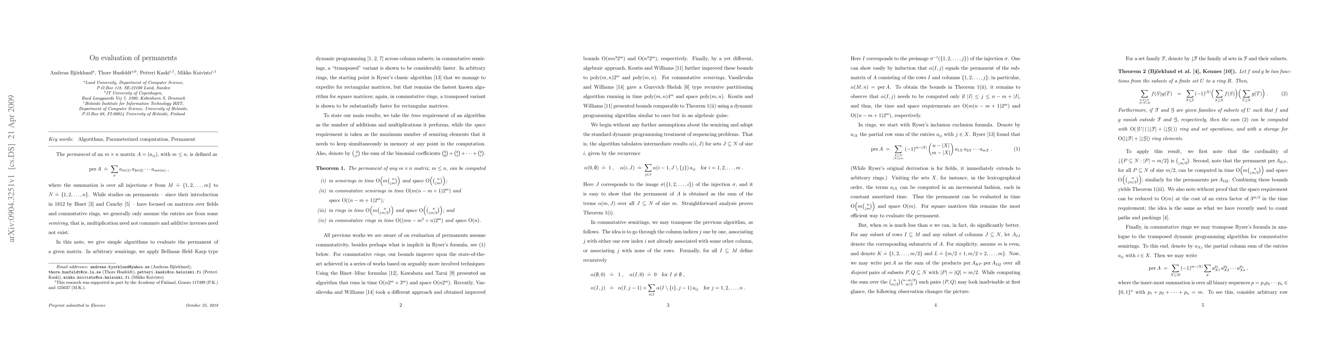 We study the time and space complexity of matrix permanents over rings and semirings.