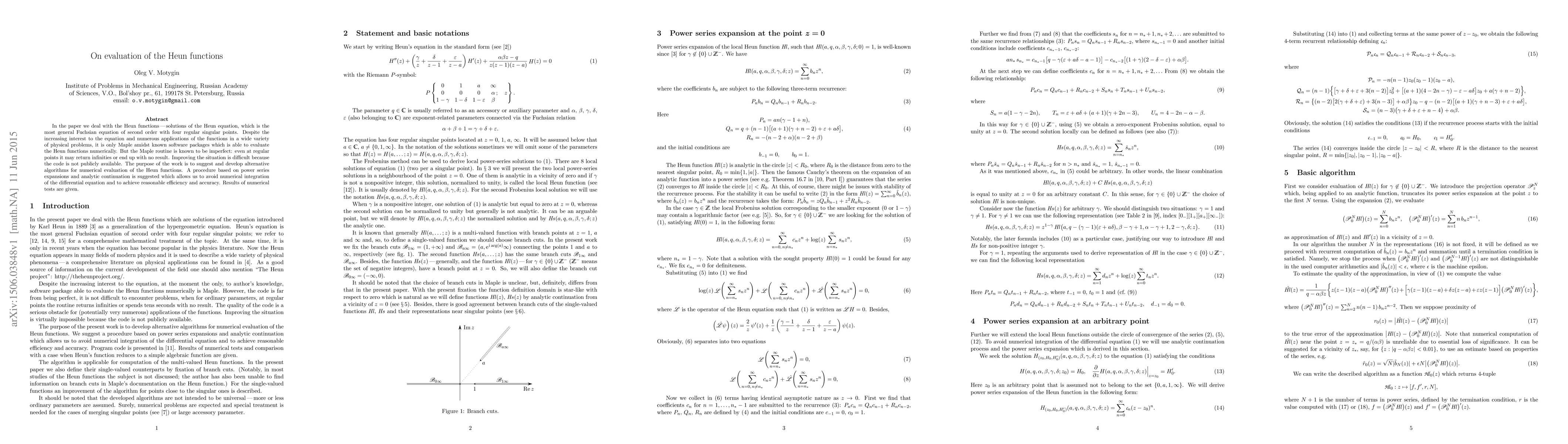 This paper proposes alternative algorithms for numerically evaluating Heun functions, which solve the Heun equation—the most general second-order Fuchsian equation with four regular singular points. It introduces a power series expansion and analytic continuation method to achieve efficiency and accuracy, addressing the limitations of existing Maple routines.