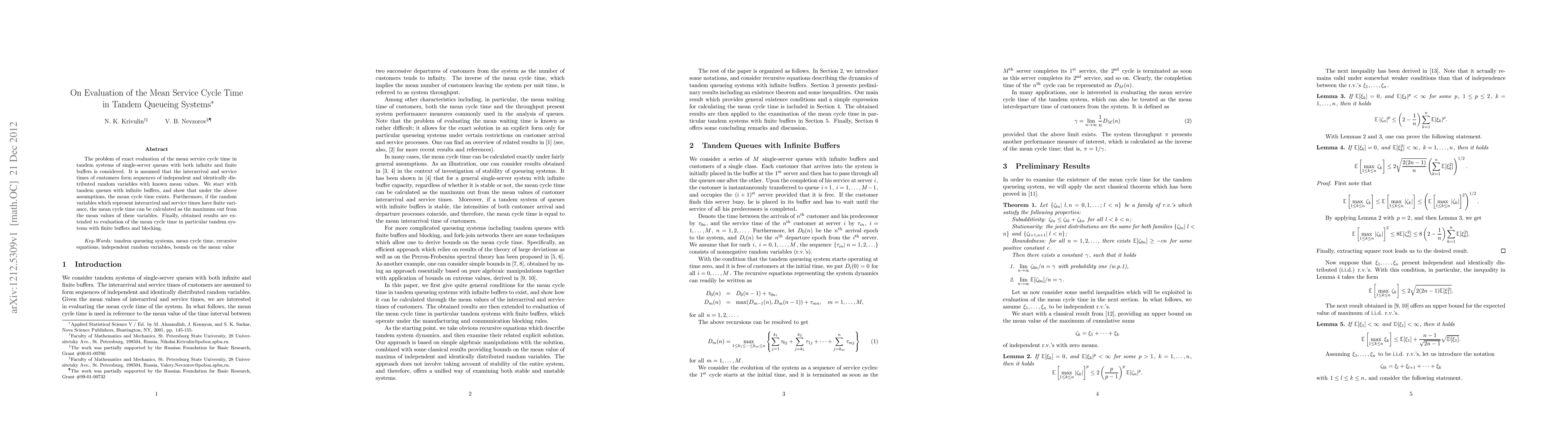 This paper evaluates the mean service cycle time in tandem queueing systems with both infinite and finite buffers, showing that the mean cycle time exists under certain conditions and can be calculated based on the mean values of interarrival and service times when their variances are finite. Results are extended to systems with finite buffers and blocking.