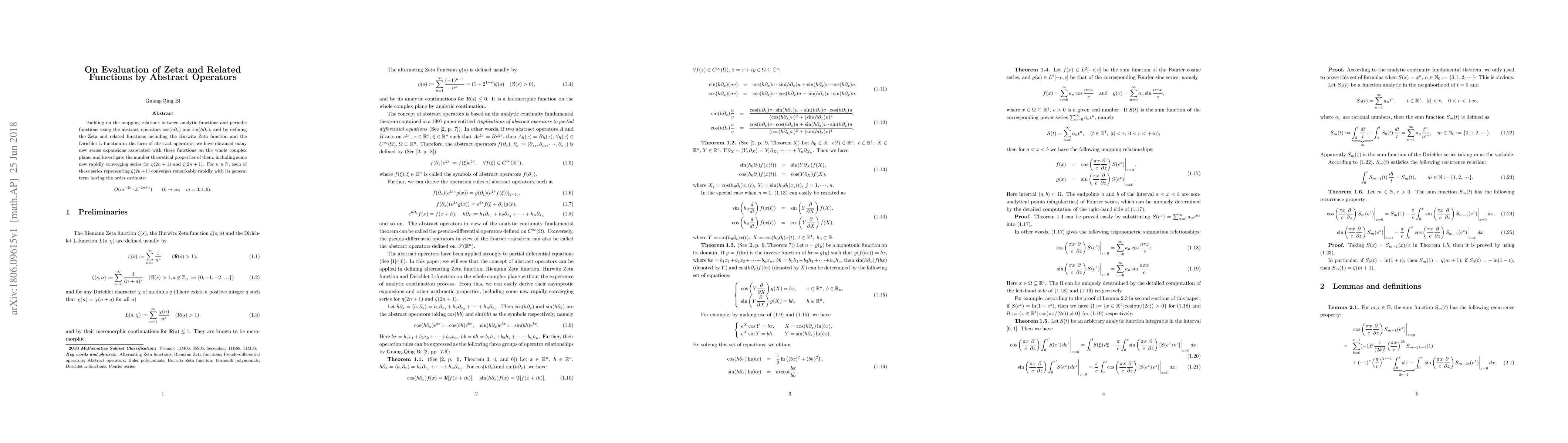 This paper explores the evaluation of Zeta and related functions via abstract operators, deriving new series expansions and investigating their number theoretical properties, including rapidly converging series for $\eta(2n+1)$ and $\zeta(2n+1)$ with an order estimate of $O(m^{-2k}\cdot k^{-2n+1})$.