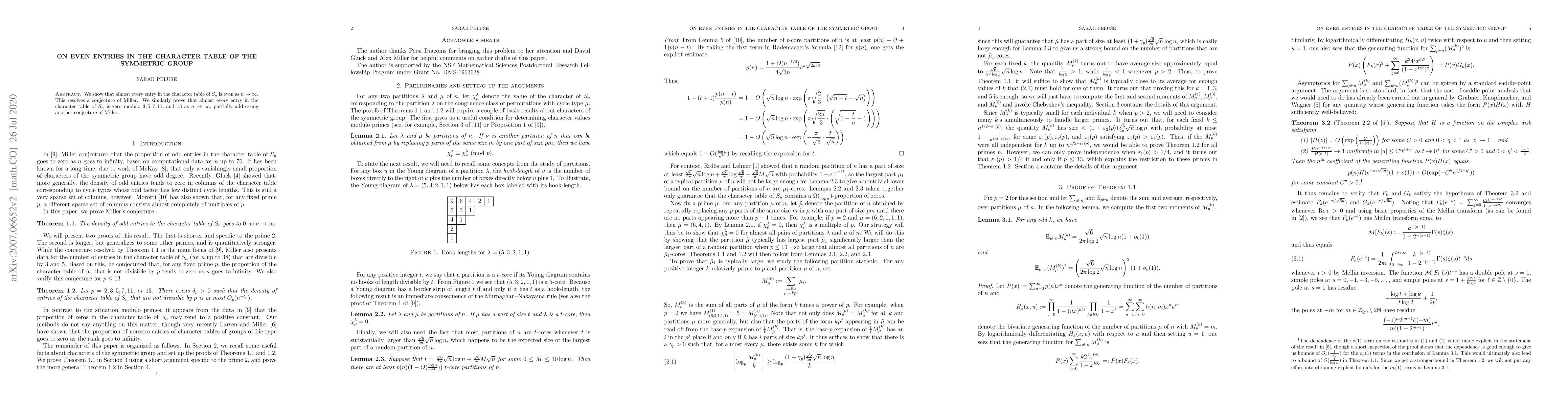 This paper demonstrates that nearly all entries in the character table of the symmetric group $S_n$ are even as $n$ approaches infinity, resolving a conjecture by Miller. Additionally, it proves that almost all entries are zero modulo $3, 5, 7, 11,$ and $13$ under the same conditions, partially addressing another conjecture by Miller.