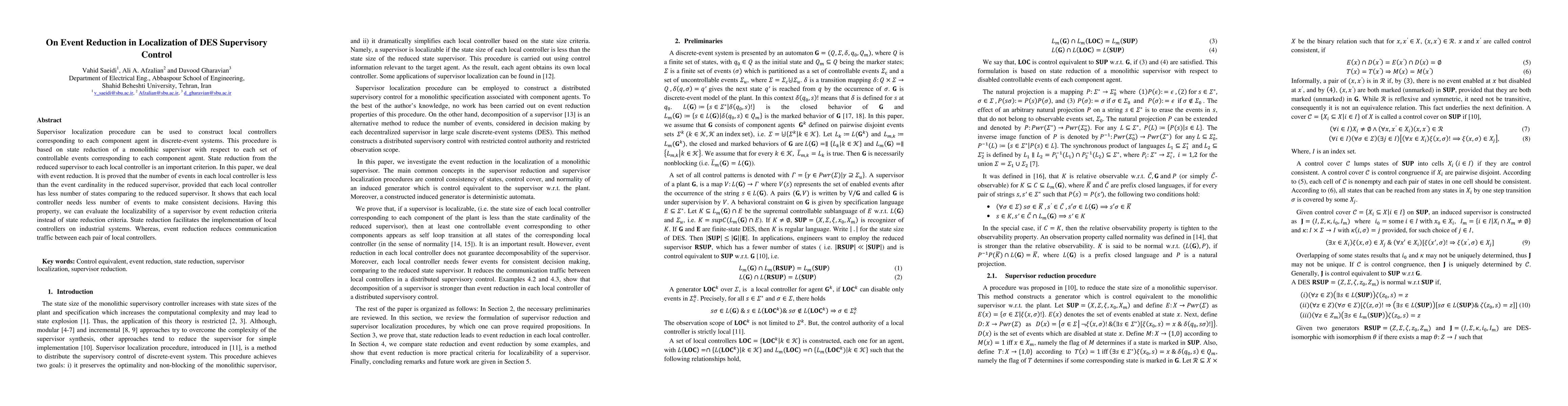 Supervisor localization procedure can be used to construct local controllers corresponding to each component agent in discrete-event systems. This procedure is based on state reduction of a monolithic supervisor with respect to each set of controllable events corresponding to each component agent. State reduction from the reduced supervisor to each local controller is an important criterion. In this paper, we deal with event reduction. It is proved that the number of events in each local controller is less than the event cardinality in the reduced supervisor, provided that each local controller has less number of states comparing to the reduced supervisor. It shows that each local controller needs less number of events to make consistent decisions. Having this property, we can evaluate the localizability of a supervisor by event reduction criteria instead of state reduction criteria. State reduction facilitates the implementation of local controllers on industrial systems. Whereas, event reduction reduces communication traffic between each pair of local controllers.