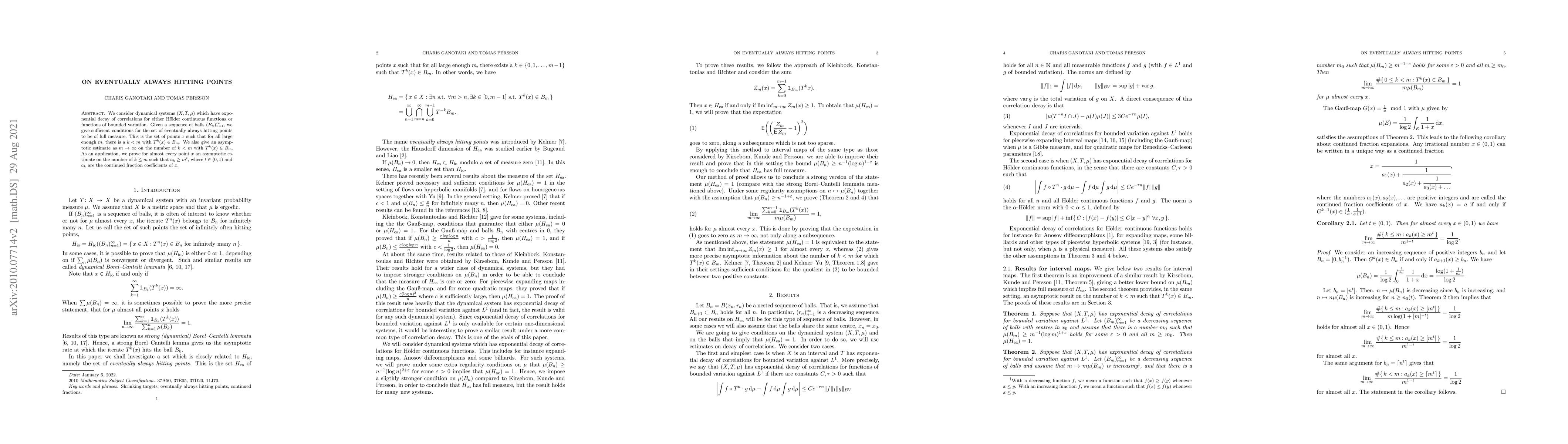 We consider dynamical systems $(X,T,\mu)$ which have exponential decay of correlations for either H\"older continuous functions or functions of bounded variation. Given a sequence of balls $(B_n)_{n=1}^\infty$, we give sufficient conditions for the set of eventually always hitting points to be of full measure. This is the set of points $x$ such that for all large enough $m$, there is a $k < m$ with $T^k (x) \in B_m$. We also give an asymptotic estimate as $m \to \infty$ on the number of $k < m$ with $T^k (x) \in B_m$. As an application, we prove for almost every point $x$ an asymptotic estimate on the number of $k \leq m$ such that $a_k \geq m^t$, where $t \in (0,1)$ and $a_k$ are the continued fraction coefficients of $x$.