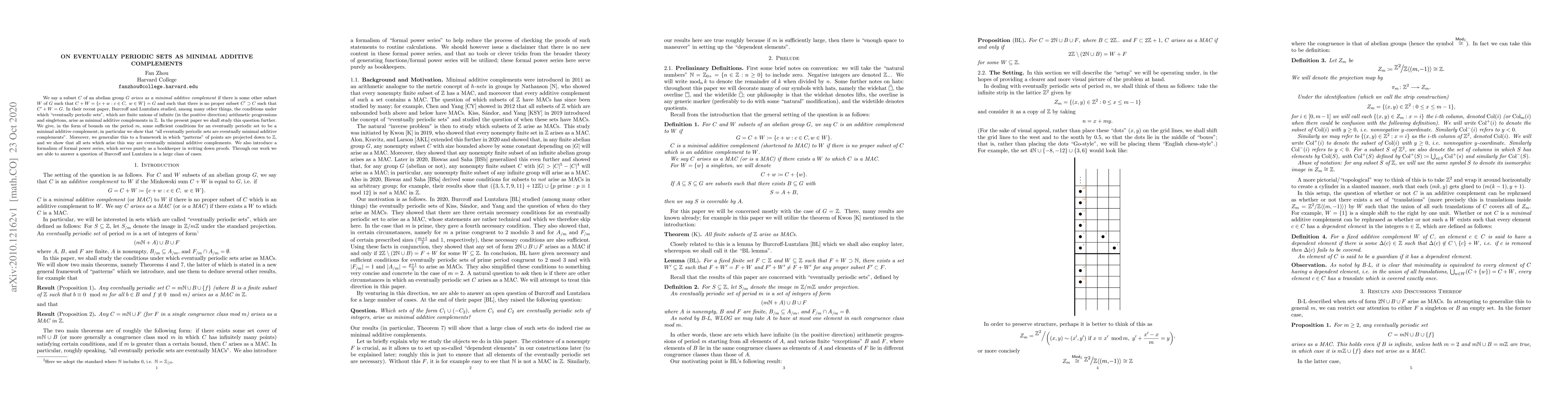 We say a subset $C$ of an abelian group $G$ \textit{arises as a minimal additive complement} if there is some other subset $W$ of $G$ such that $C+W=\{c+w:c\in C,\ w\in W\}=G$ and such that there is no proper subset $C'\supset C$ such that $C'+W=G$. In their recent paper, Burcroff and Luntzlara studied, among many other things, the conditions under which "eventually periodic sets", which are finite unions of infinite (in the positive direction) arithmetic progressions and singletons, arise as minimal additive complements in $\mathbb Z$. In the present paper we shall study this question further. We give, in the form of bounds on the period $m$, some sufficient conditions for an eventually periodic set to be a minimal additive complement; in particular we show that "all eventually periodic sets are eventually minimal additive complements". Moreover, we generalize this to a framework in which "patterns" of points are projected down to $\mathbb Z$, and we show that all sets which arise this way are eventually minimal additive complements. We also introduce a formalism of formal power series, which serves purely as a bookkeeper in writing down proofs. Through our work we are able to answer a question of Burcroff and Luntzlara in a large class of cases.