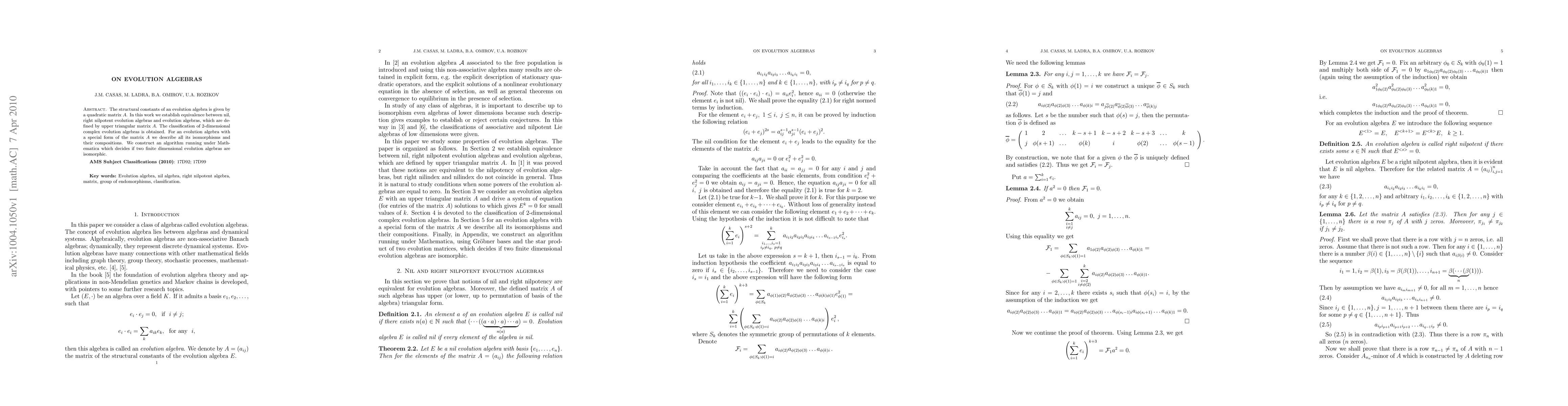 The structural constants of an evolution algebra is given by a quadratic matrix $A$. In this work we establish equivalence between nil, right nilpotent evolution algebras and evolution algebras, which are defined by upper triangular matrix $A$. The classification of 2-dimensional complex evolution algebras is obtained. For an evolution algebra with a special form of the matrix $A$ we describe all its isomorphisms and their compositions. We construct an algorithm running under Mathematica which decides if two finite dimensional evolution algebras are isomorphic.