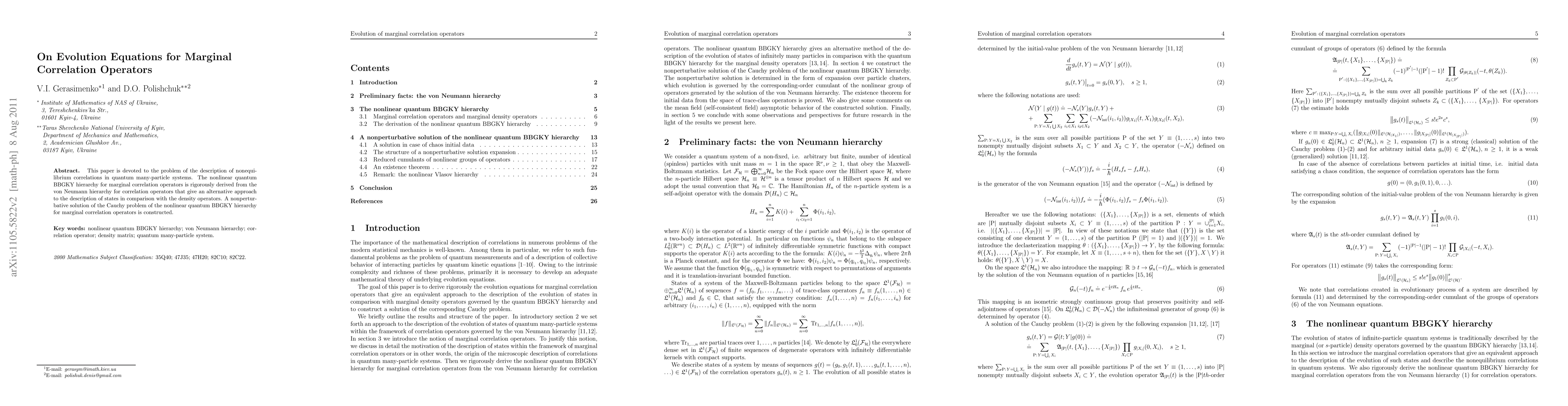 This paper rigorously derives the nonlinear quantum BBGKY hierarchy for marginal correlation operators from the von Neumann hierarchy, providing an alternative to density operators for describing quantum many-particle systems. A nonperturbative solution to the Cauchy problem of this hierarchy is constructed.