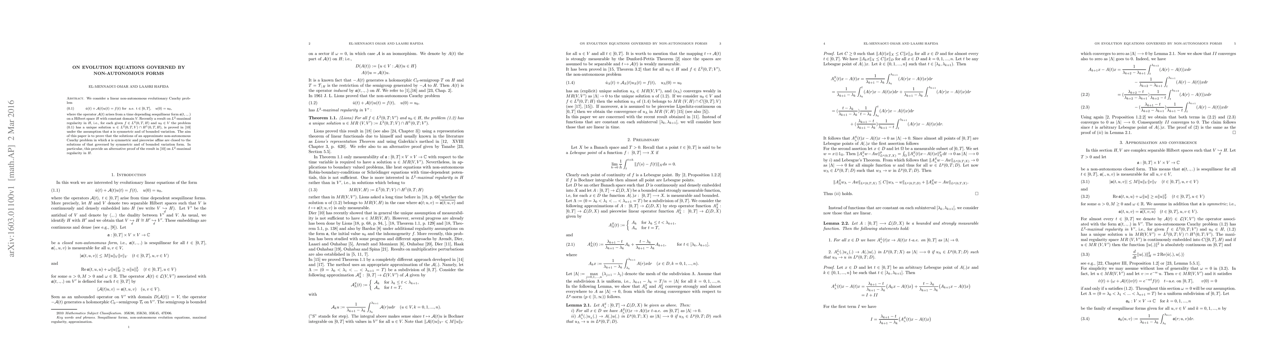 We consider a linear non-autonomous evolutionary Cauchy problem \begin{equation} \dot{u} (t)+A(t)u(t)=f(t) \hbox{ for }\ \hbox{a.e. t}\in [0,T],\quad u(0)=u_0, \end{equation} where the operator $A(t)$ arises from a time depending sesquilinear form $a(t,.,.)$ on a Hilbert space $H$ with constant domain $V.$ Recently a result on $L^2$-maximal regularity in $H,$ i.e., for each given $f\in L^2(0,T,H)$ and $u_0 \in V$ the problem above has a unique solution $u\in L^2(0,T,V)\cap H^1(0,T,H),$ is proved in [10] under the assumption that $a$ is symmetric and of bounded variation. The aim of this paper is to prove that the solutions of an approximate non-autonomous Cauchy problem in which $a$ is symmetric and piecewise affine are closed to the solutions of that governed by symmetric and of bounded variation form. In particular, this provide an alternative proof of the result in [10] on $L^2$-maximal regularity in $H.$