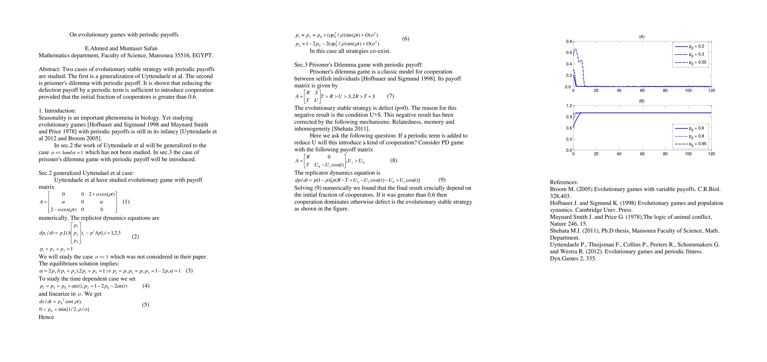 Two cases of evolutionary stable strategy with periodic payoffs are studied. The first is a generalization of Uyttendaele et al. The second is prisoner's dilemma with periodic payoff. It is shown that reducing the defection payoff by a periodic term is sufficient to introduce cooperation provided that the initial fraction of cooperators is greater than 0.6.