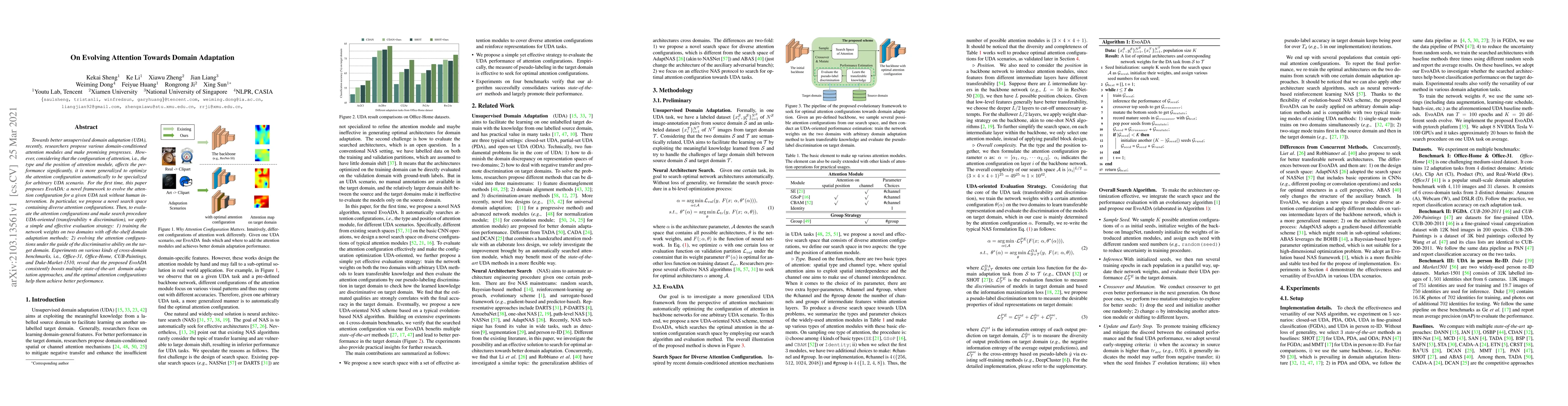 This paper introduces EvoADA, a framework for automatically evolving attention configurations to optimize unsupervised domain adaptation (UDA). It proposes a search space of diverse attention modules and an evaluation strategy focusing on transferability and discrimination, leading to improved performance across multiple cross-domain benchmarks.