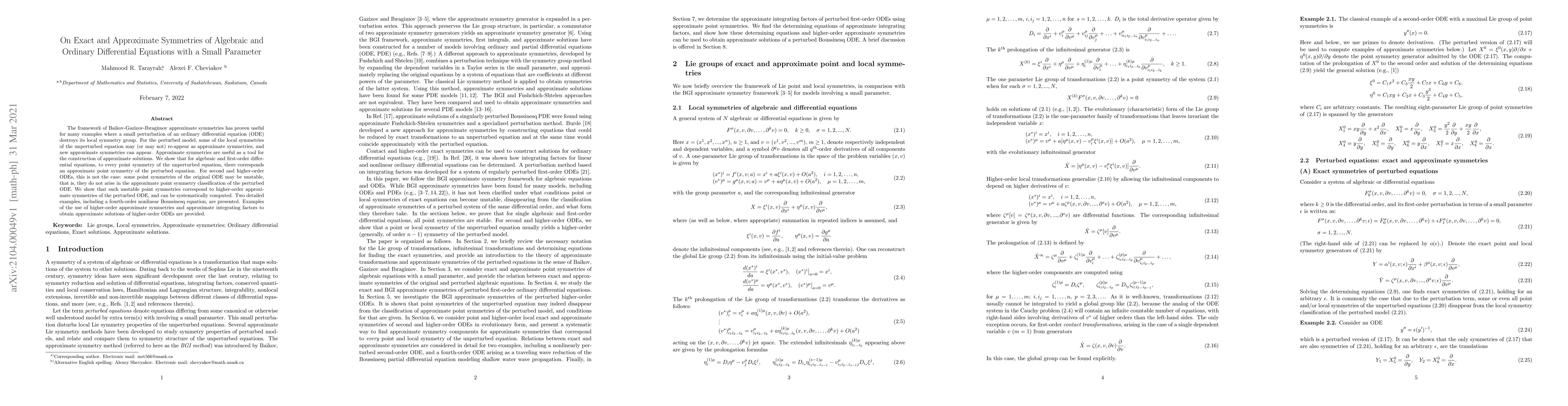 This paper explores the framework of Baikov-Gazizov-Ibragimov approximate symmetries for algebraic and ordinary differential equations with small perturbations. It demonstrates that while approximate symmetries can emerge for first-order equations, higher-order ODEs may lose some point symmetries, which correspond to higher-order approximate symmetries.