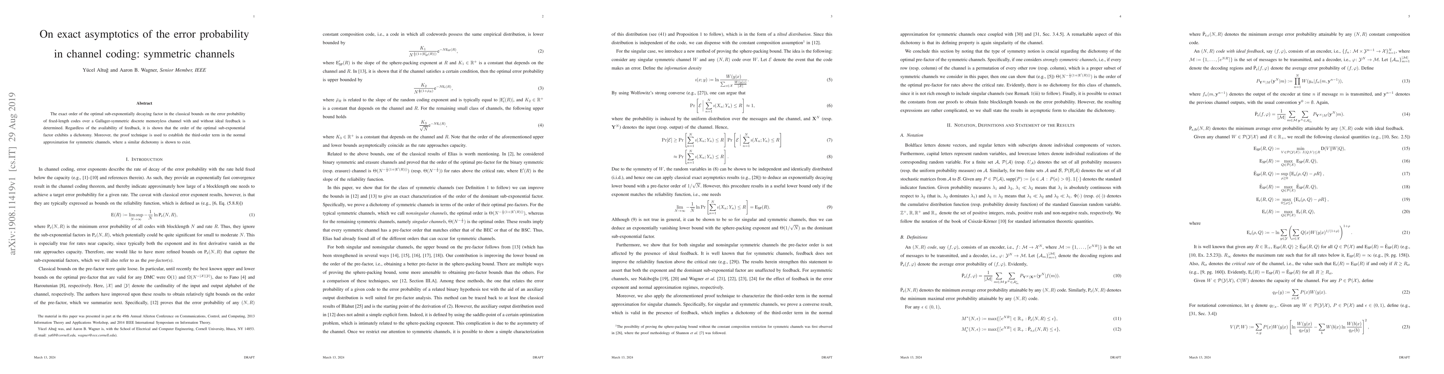 This research paper determines the exact order of error probability factors in channel coding for symmetric channels with and without feedback, revealing a dichotomy in optimal sub-exponential decay rates.