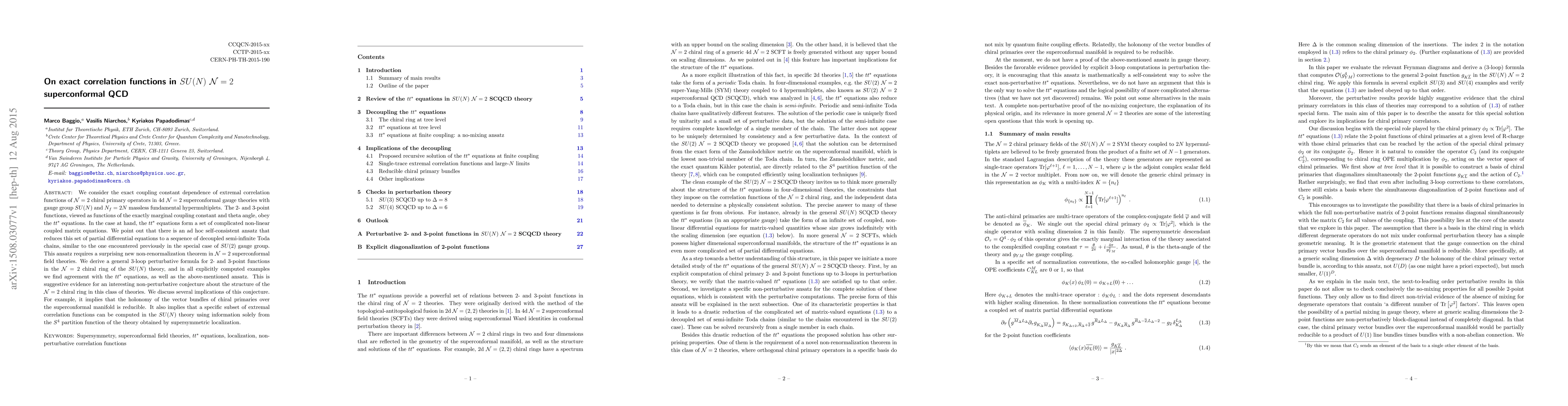 This paper investigates the exact coupling constant dependence of correlation functions in 4d SU(N) ${\cal N} = 2$ superconformal QCD, showing that the tt* equations simplify into decoupled Toda chains using a new non-renormalization theorem. It proposes a 3-loop perturbative formula for 2- and 3-point functions that aligns with the tt* equations and suggests a non-perturbative conjecture about the ${\cal N} = 2$ chiral ring structure.