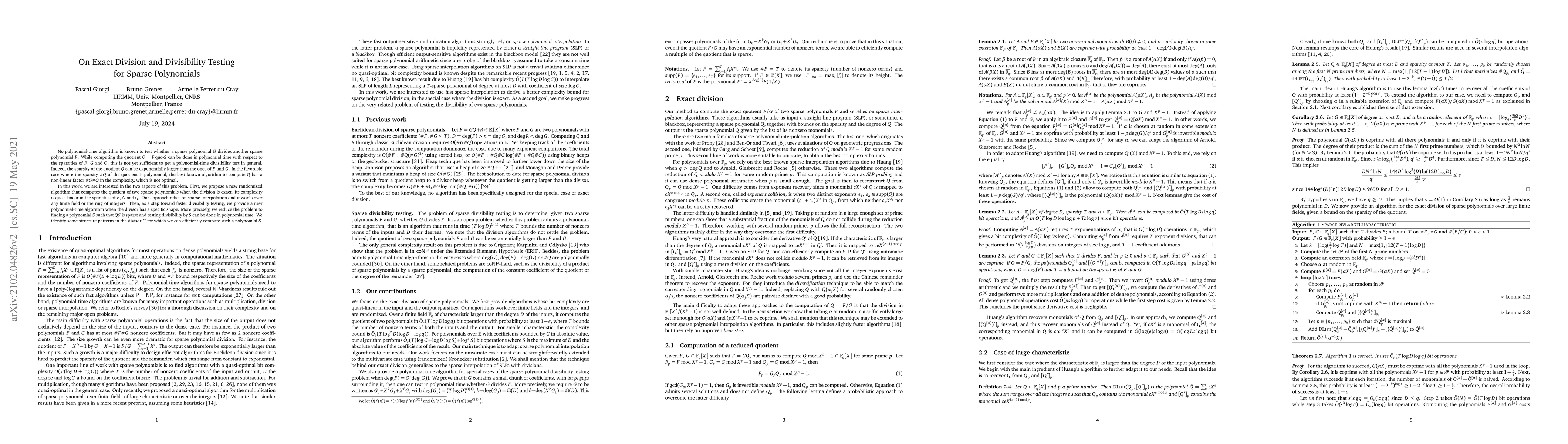 This paper proposes a quasi-linear time randomized algorithm for computing the exact quotient of two sparse polynomials using sparse interpolation. It also introduces a polynomial-time divisibility test for specific structured divisors by reducing the problem to finding a sparse polynomial S that facilitates efficient divisibility testing.