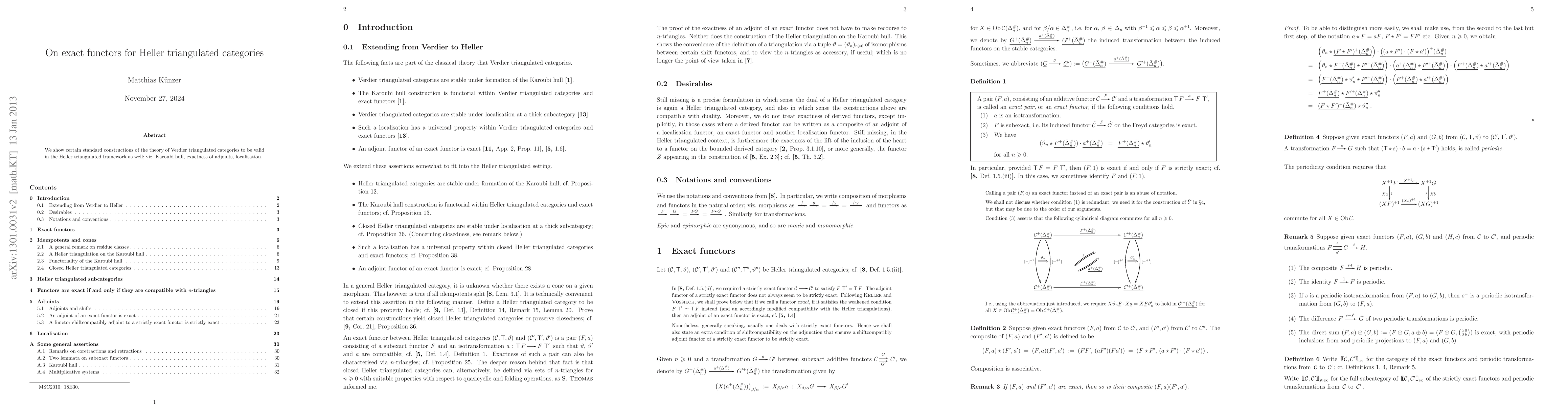 We show certain standard constructions of the theory of Verdier triangulated categories to be valid in the Heller triangulated framework as well; viz. Karoubi hull, exactness of adjoints, localisation.