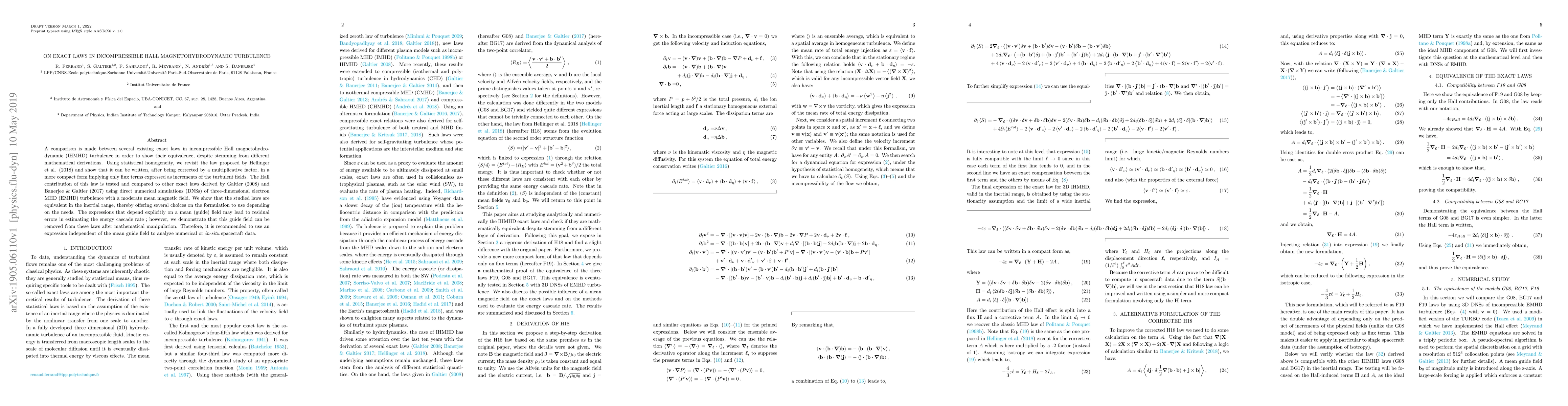 A comparison is made between several existing exact laws in incompressible Hall magnetohydrodynamic (IHMHD) turbulence in order to show their equivalence, despite stemming from different mathematical derivations. Using statistical homogeneity, we revisit the law proposed by Hellinger et al. (2018) and show that it can be written, after being corrected by a multiplicative factor, in a more compact form implying only flux terms expressed as increments of the turbulent fields. The Hall contribution of this law is tested and compared to other exact laws derived by Galtier (2008) and Banerjee & Galtier (2017) using direct numerical simulations (DNSs) of three-dimensional electron MHD (EMHD) turbulence with a moderate mean magnetic field. We show that the studied laws are equivalent in the inertial range, thereby offering several choices on the formulation to use depending on the needs. The expressions that depend explicitly on a mean (guide) field may lead to residual errors in estimating the energy cascade rate ; however, we demonstrate that this guide field can be removed from these laws after mathematical manipulation. Therefore, it is recommended to use an expression independent of the mean guide field to analyze numerical or in-situ spacecraft data.